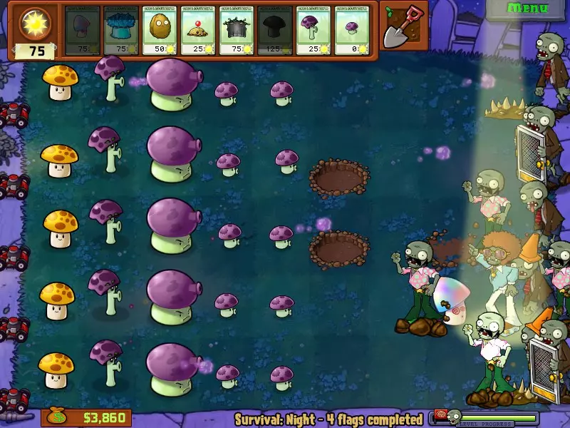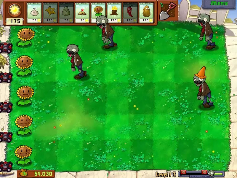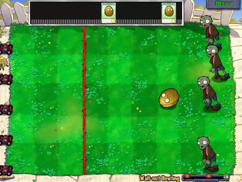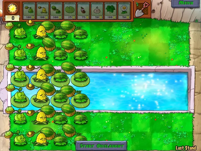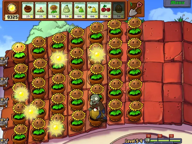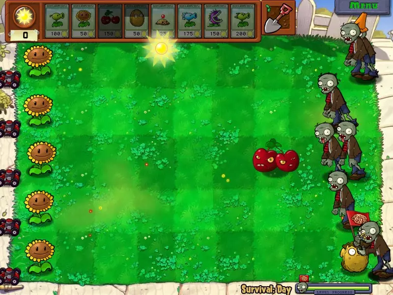 这个成就看似困难,实则非常简单,你可以在任意关卡完成!只需在场景中只留下一个僵尸,然后在整片草地上种植向日葵,只留一个空格放置坚果障碍物或大型坚果即可。