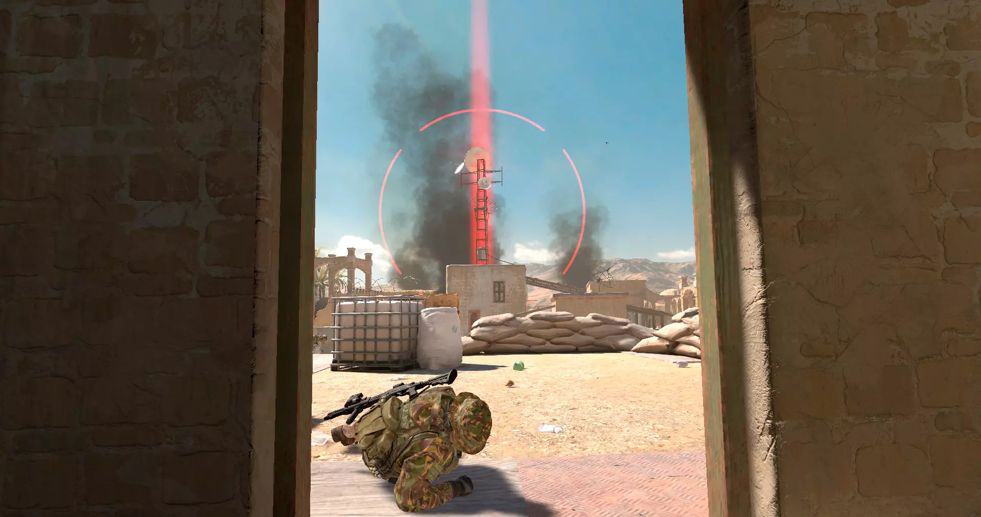 这还不是全部。要不惜一切代价保护发信器。坐在楼梯上的三名玩家中,必须至少有一人存活,这是最基本的获胜条件。如果有人在楼梯上或建筑物内的二楼死亡,你需要移动到能够标记对面建筑物天线的位置,通过门即可。无论狙击手怎么尝试,都无法抬高镜头来标记那个天线。可能会出现这样的情况:最后一名存活的玩家为了保命而战斗,无法保护正在攻击某个机枪手的传送器。如果队伍能在关键时刻迅速标记高射炮和天线,机器人可能根本来不及摧毁传送器。