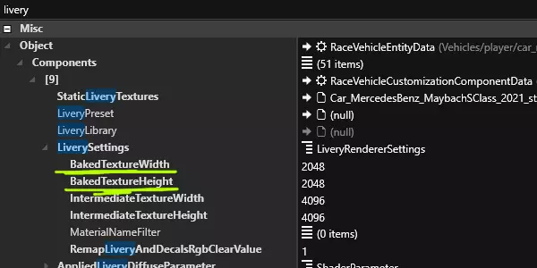 找到文件后,在搜索框中搜索“Livery”,展开搜索结果,直到找到“LiverySettings”。在该选项中,你会看到“BakedTextureWidth”和“BakedTextureHeight”。