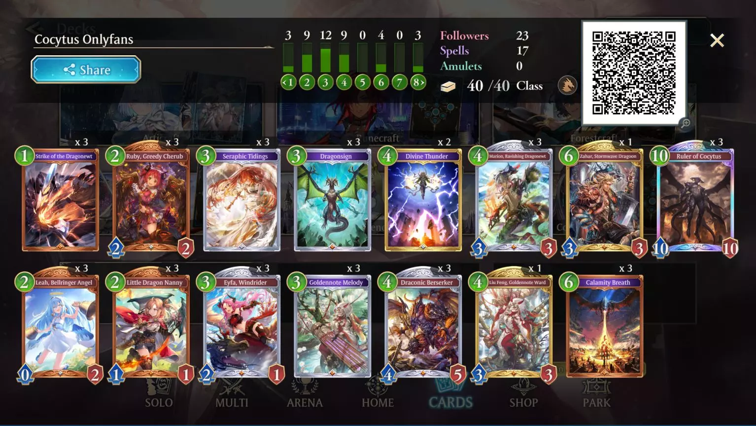 Note that this deck requires massive draw power so that Dragonsign and Liu Feng can be obtained ASAP. Plus, having all those extra cards in your hand is actually pretty necessary for when your deck gets replaced with the Cocytus one, as the cards remaining in your hand become your lifeline until the Cocytus cards can actually take effect. Ruby, Greedy Little Cherub - Ruby is an entirely underrated bronze-rarity card that polishes your hand by cycling what could be a godawful brick that you don't want/need right now for a minty-fresh card straight from teh deck. She also then becomes a 2/2 presence on the field, to boot, and all this for 2 cost. Ruby is an absurdly good card that deserves to be at least legendary-rarity and 10 cost, if not better/more (ok, I'm exaggerating a bit now). People are absolutely sleeping on this gem. For this Cocytus-Fu deck specifically, Ruby can help you find Dragonsign/Liu-Feng if you weren't able to get one during mulligan, and helps cover for the fact that my deck has only 1 Liu-Feng Q_Q by providing chances to cycle for it. Little Dragon Nanny - Followers with Intimidate (can't be attacked) ability are a nuisance at least and potentially game-winning at best, making them this deck's backup win condition strategy. Nanny summons a 1/1 ally with Intimidate on fanfare and a second one on evolve. If your opponent isn't equipped to handle intimidate, you've already won. Seraphic Tidings - Hypothetical people tell me that this might be too much draw-power for the deck, which already has Leah and Goldennote. I say that even if you have some of these draw-cards unplayed in your hand after you summon Cocytus, when you play them you'll be drawing OP Cocytus cards by the boatload! What NOW hypothetical people? Huh? Tell me what now? That's what I thought. Eyfa Windrider - 2 attack follower with Storm, making her an excellent fast impact card. When played while in Overflow, she gets Intimidate, becoming part of this deck's secondary win strategy, but don't be stingy and absolutely play her early to just immediately clear something troublesome on the board if necessary. There are plenty of Intimidate followers in this deck to spare. Dragonsign - The linchpin of Cocytus-Fu. Gives you +1 max PP, allowing you to play the big cards earlier, such as Cocytus. It bears repeating that you should play this as soon as you can, and if you're going second, save your bonus play point for turn 2, just to play this card. Goldennote Melody - A slightly better version of Serpahic Tidings that is exclusive to Dragoncraft. In addition to the draw-power, it heals you for 2 health if you're in Overflow. Divine Thunder - All the ramping and drawing you do will leave you quite vulnerable to enemy attack. Divine Thunder helps allieviate that issue by deleting the biggest attack-power baddy field, and then blasting all the other enemies for 1 damage. Part of our lifeline while waiting to draw the good Cocytus cards, and excellent against enemies that can't be targeted, like Portalcraft's Masterwork Omega. Draconic Berserker - 4/5 presence on the field that will nuke a single target for 4 damage on evolve, or nuke all enemies on the field for 4 damage on super-evolve. Board clear is what keeps this deck alive while you ramp and draw, as well as while you wait for the good Cocytus cards to land in your hand. This card has board clear in spades. Marion Dragonnewt - Gives an ally +2/+2 or +3/+3 if in Overflow. He is part of our backup win-condition engine; used solely to buff friendly followers with Intimidate, making these untouchable hitters even beefier and slappier. Liu-Feng, Goldenote Ward - The only other piece of ramp power this deck has; grants +1 max PP when she evolves. Has 3/3 stats and will evolve for free if played in Overflow, but don't hesitate to play her before overflow to manually evolve with an evolution point; that extra play-point is absolutely necessary as soon as possible. QQ for me because I only have 1 of her. Pleeaaaaaaaaaase, Shoddyverse! Giff me moar Liu-Feng!!! Zahar, Stormwave Dragoon - 3/3 presence with ward that, upon fanfare, summons a beefy 5/5 Intimidate ally. Part of our backup win-condition engine, Zahar is also one of the only other follower in this deck that has ward, making him a nice meat shield for your face. Calamity Breath - Nukes everything on the board for 6 damage. Keeps the enemy board clear while you ramp and draw, and while you wait for the blessings of Cocytus. Play it before putting allies down, as It'll rock them too, though you shouldn't have very many ally cards if all you're doing is ramping and drawing, or the allies that you do have will be beefy ones that can tank it. Replacing these is fine if you have something better, like additional Liu Fengs, or pretty much any gold/legendary-rarity card in general. Ruler of Cocytus - See the above section dedicated to this card. I hope Sempai notices me! Teh Mulligans and Teh Playing A Match The gist of how to play this deck is already in the intro, but here's some further details: Mulligan everything except Dragonsign and Liu Feng. Ramp and draw as early and often as possible. Between ramping and drawing, try to keep the enemy board clear with the nukes in the deck, and play the Intimidate cards to force the enemy to use their removal cards to deal with them. If you find that the enemy doesn't have a way to deal with Intimidate, it could be worth spending an evo point on one of those untouchable followers, as they might win the match just by slapping the enemy in the face with impunity. I've certainly won more than one match this way. If Intimidate doesn't win the match for you, save an evo or super-evo for Cocytus and play him ASAP. The nature of this deck will mean that you'll probably have some remaining draw-power cards in your hand when the deck turns Cocytus, meaning that you'll be able to quickly fill your hand with these op cards, that or you'll have the board clear to be able to stall the g