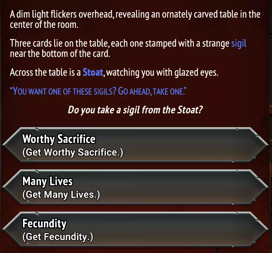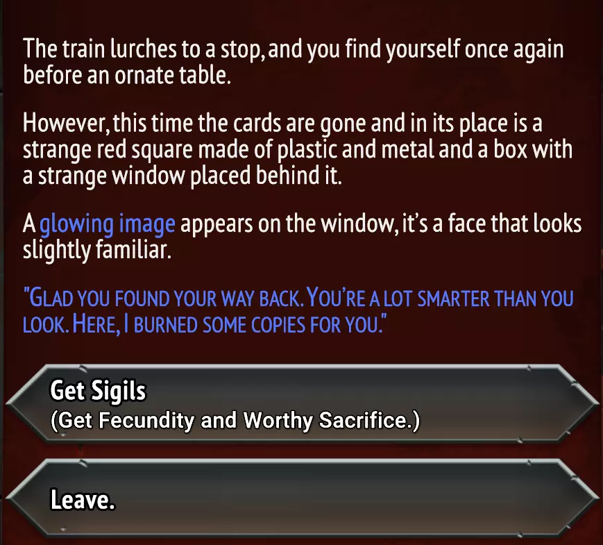 选择以下选项: 交易神器:献祭已选神器,从未知池中获得两个随机神器。 从他手中获取神器:获得历史学家的剃刀。(可能有其他选项?) 神器:友方单位获得+10力量,但每拥有一个非首领神器,力量-1。 天使之路