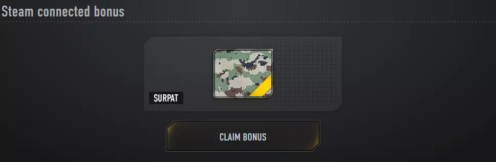 在此处输入您的登录名和密码。 这些字段可能会根据您是否已在浏览器中登录账户而自动填充。如果您未通过浏览器登录Steam账户,则需要从浏览器或手机输入验证码。 绑定Steam账户时,您将获得额外奖励【SURPAT迷彩】,该迷彩呈现像素图案。