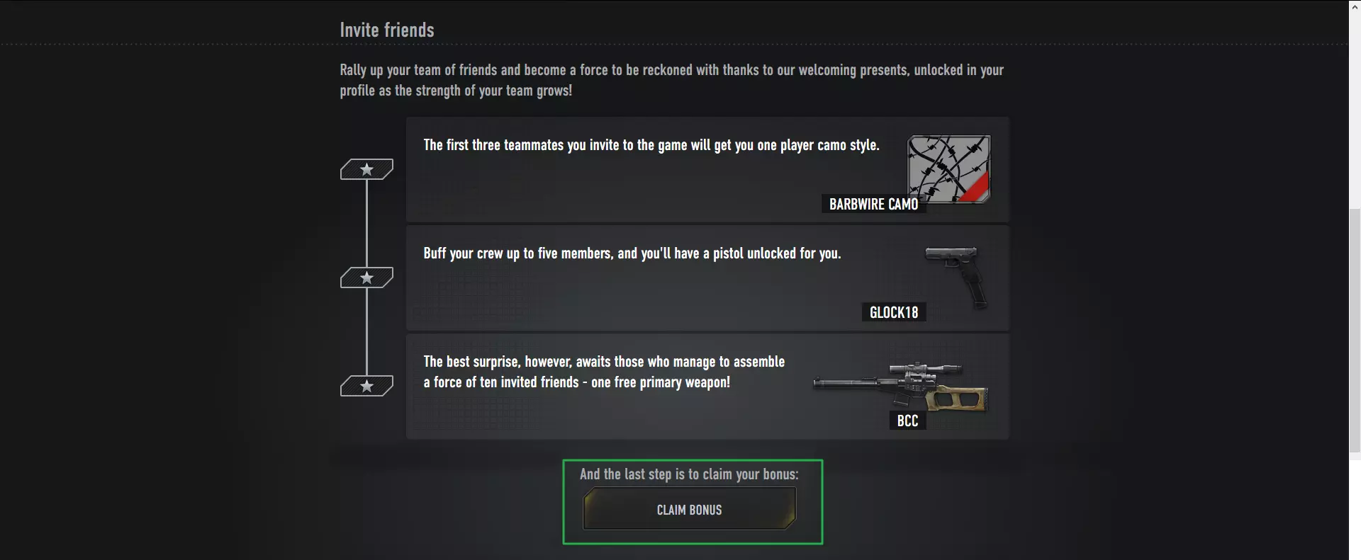 你将拥有一个私人链接,你的朋友可以点击该链接按照你所做的相同步骤操作,以领取所有奖励。此外,在图片中你可以看到当有人通过你的推荐链接注册后,相关显示的示例。白色的+1表示他们已注册并关联了Steam账户。红色或白色的-1表示该账户已注册过。推荐奖励条件:当有3位朋友通过你的推荐链接注册后,你将获得【BARBWIRE CAMO】样式,该样式在灰色背景上呈现铁丝网图案。这是满足上述条件的推荐参与者专属奖励。