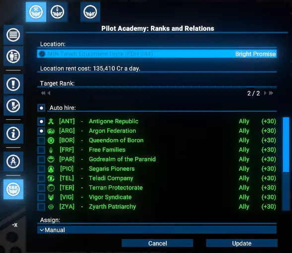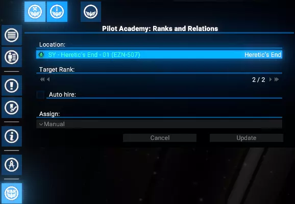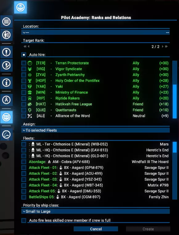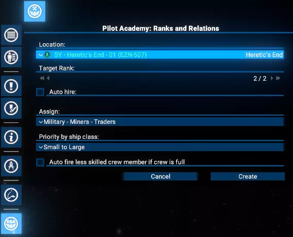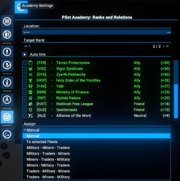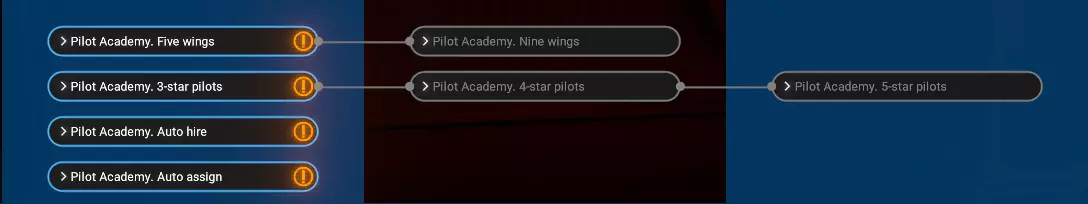 这将自动从选定派系招募新学员,玩家需支付标准招募费用。 自动分配训练完毕的飞行员 研究完成后,玩家可在学院界面启用自动分配功能。这允许玩家根据舰船角色和尺寸,为达到目标等级的飞行员设置分配优先级。