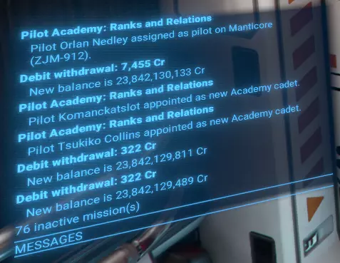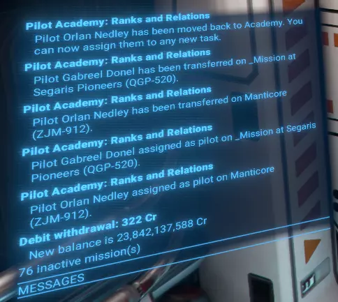 当舰船没有空余位置来转移学员时:【%s 没有空余船员容量进行飞行员调换!】 当新学员被分配到飞行联队时:【学员 %s 被分配为 %s 的飞行员。】