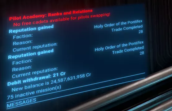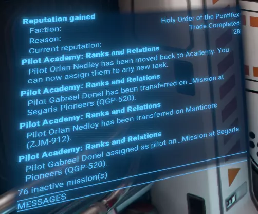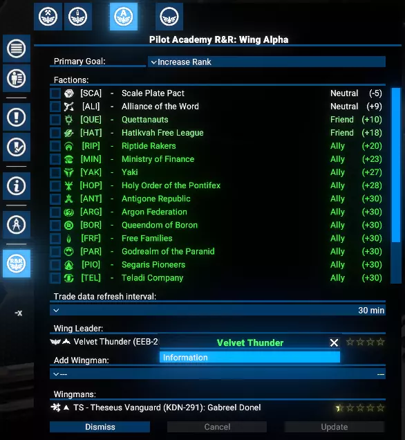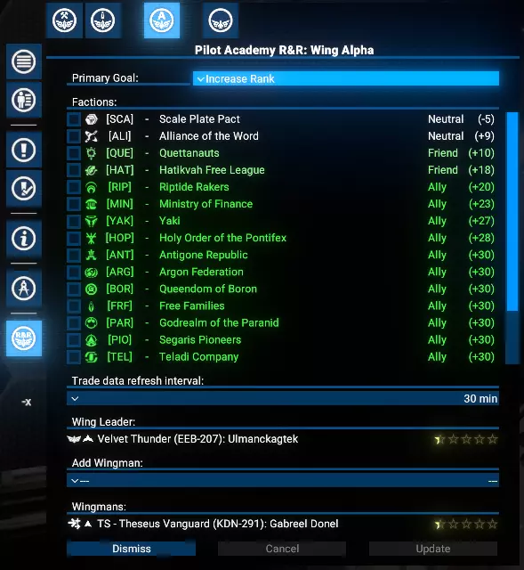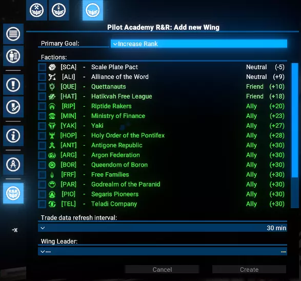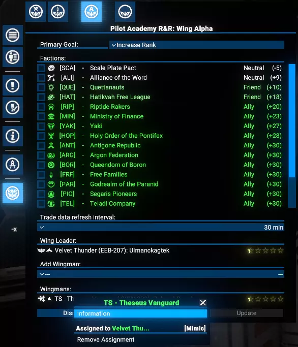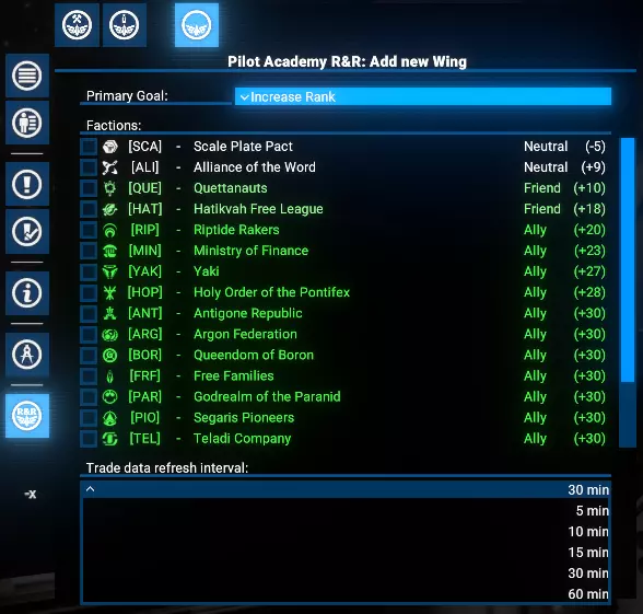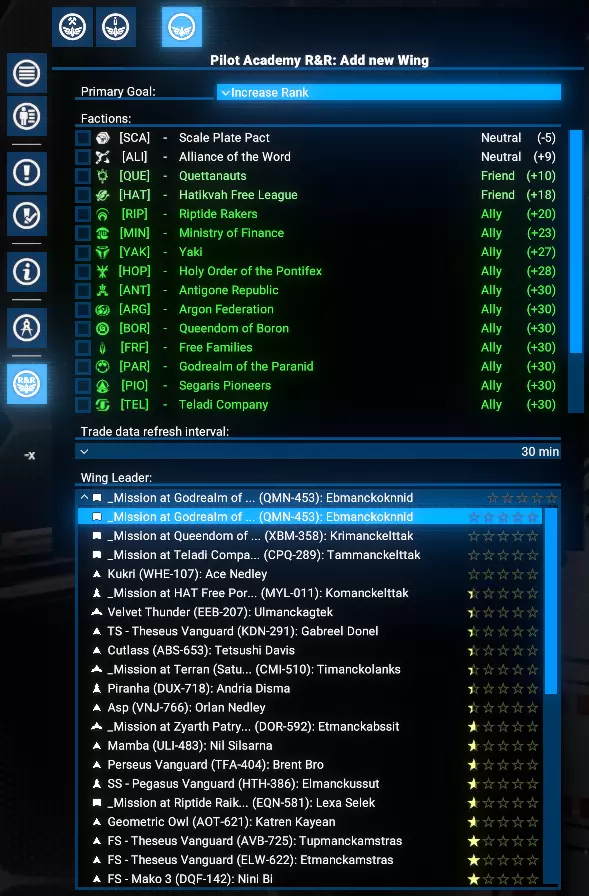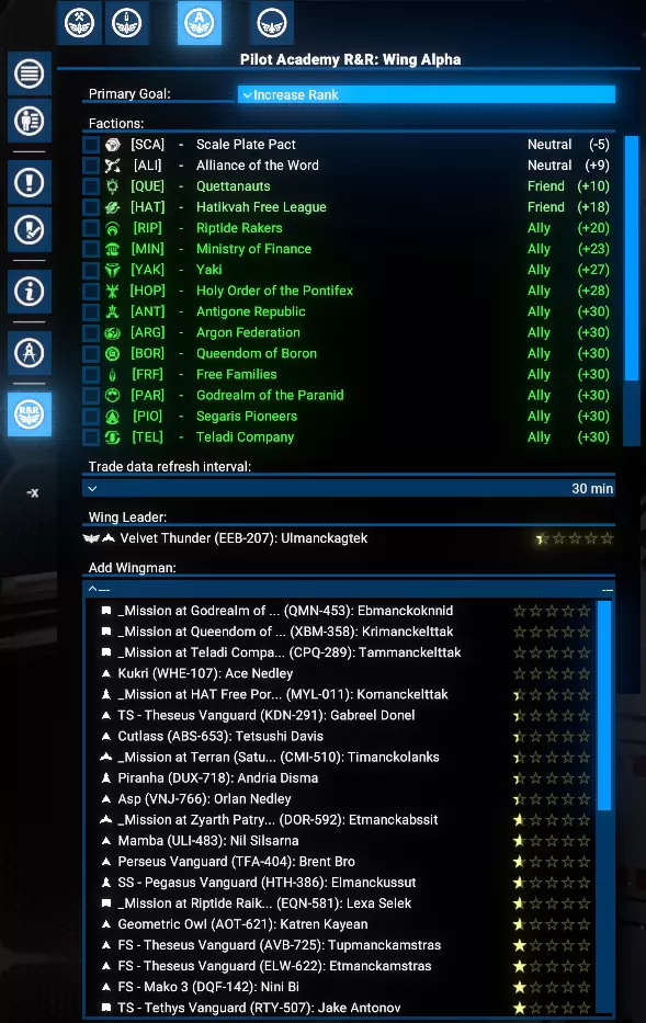 功能 直观用户界面:轻松管理学院的所有运营。 飞行员训练:通过贸易操作有效训练飞行员。 势力关系:通过贸易提升玩家与其他势力的声望。 飞行编队组织:将玩家的学员编成飞行编队,以便高效管理。 目标选择:优先进行飞行员训练或提升势力关系。 势力限制:为每个飞行编队限制特定势力的训练和关系建设活动。 可研究升级: 扩展至9个飞行编队。 将飞行员训练至5星等级。 自动从选定势力招募学员。 根据优先级自动将训练好的飞行员分配到玩家的飞船上。 限制与注意事项 限制 学院目前仅支持小型(S级)飞船。训练过程中使用的交易无利润,且每笔交易仅使用一件所选商品。 注意 这是一个复杂的模组,可能存在未发现的问题。请报告任何问题。 需求与安装 需求 《X4:基石》:8.00HF3版本或更新。 UI扩展与HUD:kuertee的v8.0.4.0版本或更高。 可在Nexus Mods获取:UI扩展与HUD 模组支持API:SirNukes的1.95版本或更高。 可在Steam获取:SirNukes Mod Support APIs 可在Nexus Mods获取:Mod Support APIs 安装 Steam创意工坊:Pilot Academy: Ranks and Relations Nexus Mods:Pilot Academy: Ranks and Relations训练流程 设置学院位置后,玩家可以创建第一支飞行编队。 飞行编队创建完成后,可以向其中添加任意数量的僚机成员。 飞行编队创建后会立即触发一项特殊指令,自动搜索最佳贸易交易以提升等级和关系。 每次交易完成后,会检查飞船飞行员当前等级是否达到目标等级。 若已达到等级,将检查学院空间站是否有学员,如有则将首位可用候选人调至飞船。 若未检测到学员,将检查自动雇佣选项。若启用,将为飞船雇佣一名新学员并支付相应费用。 若没有可用学员且自动雇佣已禁用,脚本将在3分钟后重复上述检查。否则,舰船上的训练飞行员将与学员交换,然后调往学院站。 如果分配选项未设置为手动,且距离上次分配回合结束已至少2分钟,将启动自动分配程序。 根据分配设置,将选择飞行员等级较低(且低于目标等级)的舰船。 请注意:如果船员已满,默认情况下会收到警告通知,且不会执行飞行员交换。但如果启用了【船员已满时自动解雇技能较低船员】选项,将自动解雇资质较低的船员,为新飞行员的调遣腾出空间。若发现此类舰船,训练飞行员将被指派为该舰船的飞行员,原飞行员将被调往学院站担任新学员。 每3分钟,自动分配程序将重复运行,以检查是否有可用的训练飞行员。 学院窗口 安装后,左侧菜单栏会出现一个新图标。点击该图标可打开学院管理窗口。 学院窗口有三种类型的标签页: 学院设置 学员与飞行员 联队管理标签页,包括新建联队 学院设置 学院设置标签页包含位置、目标技能等级、自动招募以及自动分配训练飞行员的控制选项。