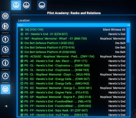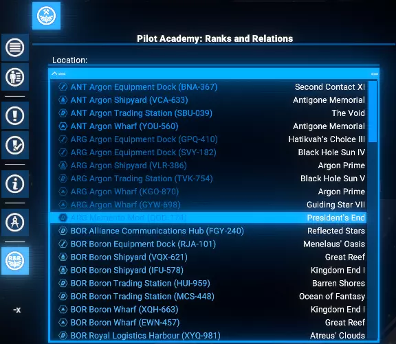 学院位置 学院将玩家拥有的或其他派系的指定空间站作为学员和训练飞行员的生活区。 在游戏初期,玩家可能尚未拥有任何空间站,此时可根据玩家与其他派系的声望值,使用他们的造船厂、船坞或贸易站。