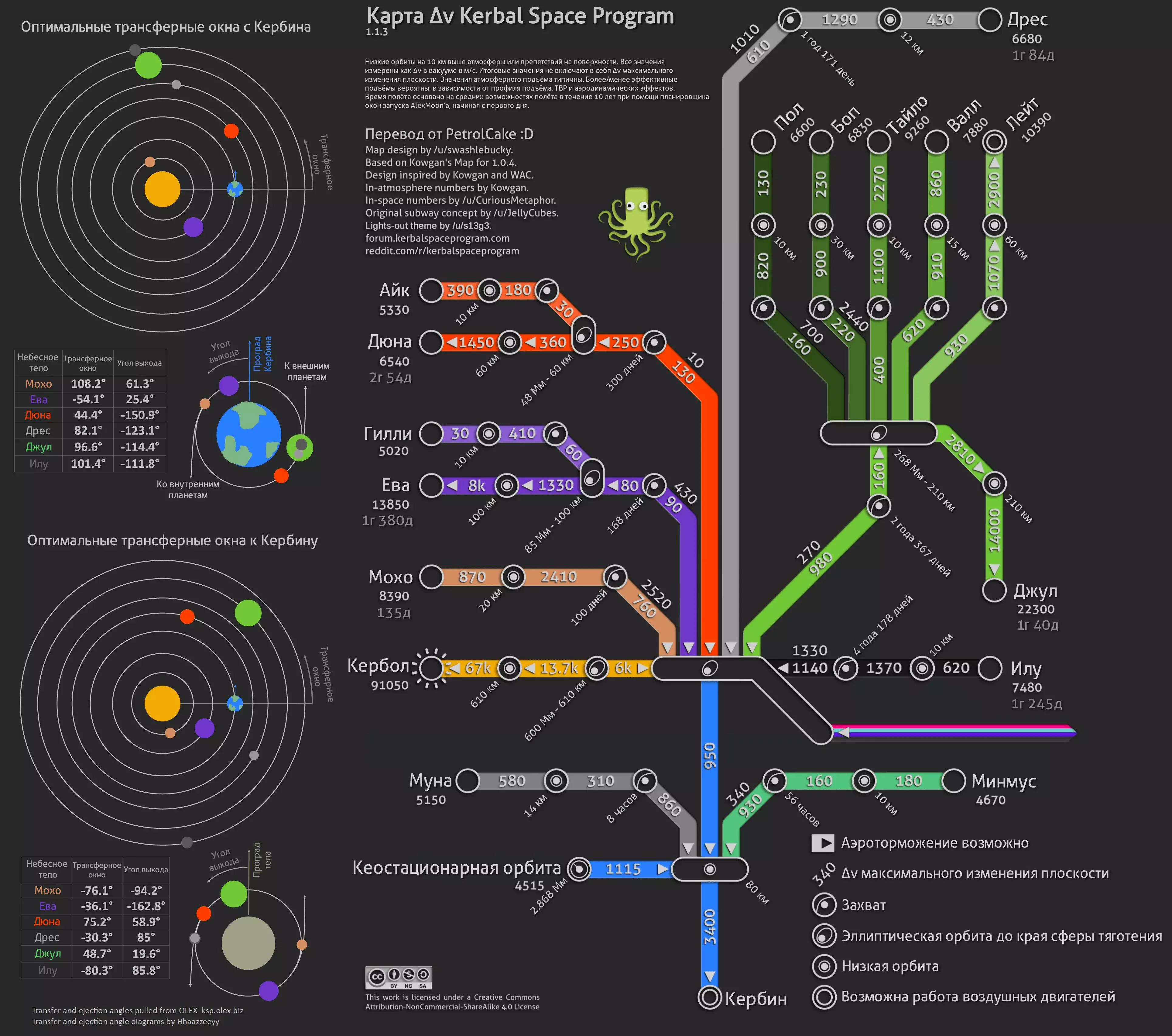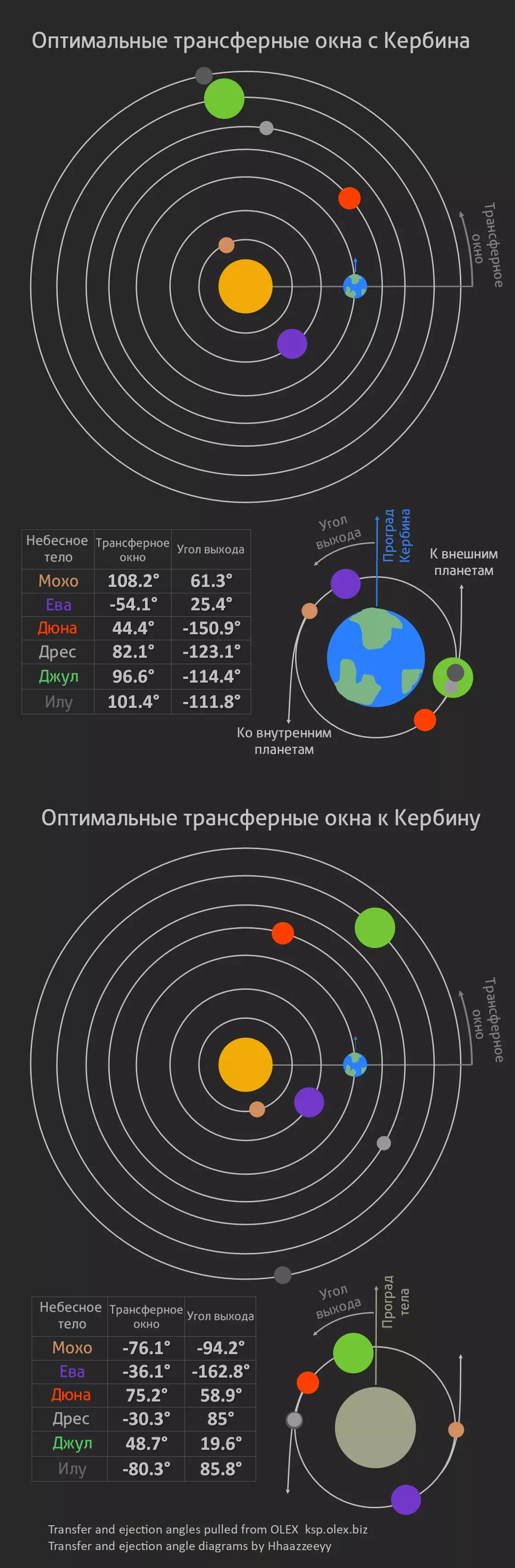 不知为何,我翻译的Δv地图与往返Kerbin的转移窗口地图合并在了一起。 如何使用? Δv地图 太空中的所有机动都通过一个动作完成——改变轨道。在这张地图上,每条线都代表一个这样的改变,也称为航向修正。同时,线上标注了执行该修正所需的Δv值。例如,要从坎巴拉低轨道进入前往 Mun的轨道,需要将速度提升至860米/秒,并且事先将航天器的头部指向正确方向。若要了解多个机动所需的Δv(德尔塔-v),需从起点到终点画一条线,并将线上显示的速度值相加。假设要从航天中心到达沙丘的低轨道,需要3400(Kerbin低轨道)+950(恒星椭圆轨道)+130(进入前往沙丘的轨道)+250(减速并进入沙丘椭圆轨道)+360(轨道调整)。总计约5000米每秒。返回的路径遵循完全相同的模式,但有一个细节——通常返回Kerbin时会使用降落伞着陆(这是最简单的方法),因此可以省去克服Kerbin引力所需的3400Δv。从Duna飞往Kerbin仅需1600米/秒的速度增量。作为地图路径上的额外信息,会显示轨道高度(若轨道非圆形,则会显示近地点和远地点)或预计飞行时间。转移窗口地图 使用转移窗口时操作很简单,如果需要飞往环绕Kerbin运行的行星,只需等待该行星与Kerbin的相对位置符合上图所示即可。需要注意的是,Kerbin的朝向也应与图片一致,即从顶部视角看,Kerbin的运行方向应朝上。下方是包含转移窗口角度具体数值的表格以及示意图,其中最重要的是“指向外行星”(迪恩、德雷斯、朱尔、伊卢)和“指向内行星”(伊娃、莫霍)的向量。在规划与行星会合的机动时,需等待行星运行至合适位置,然后将机动起点设定在目标行星所在位置,且机动的最终向量应至少大致与“指向目标行星”的向量相符。外部/内部行星。 如果要返回Kerbin,操作类似,此时我们需要关注下方的地图和示意图。需要在您想要返回的行星图标位置进行机动(当然,要等待该行星相对于Kerbin处于合适位置,并将机动向量与最近的逃逸向量对齐)。 Δv地图