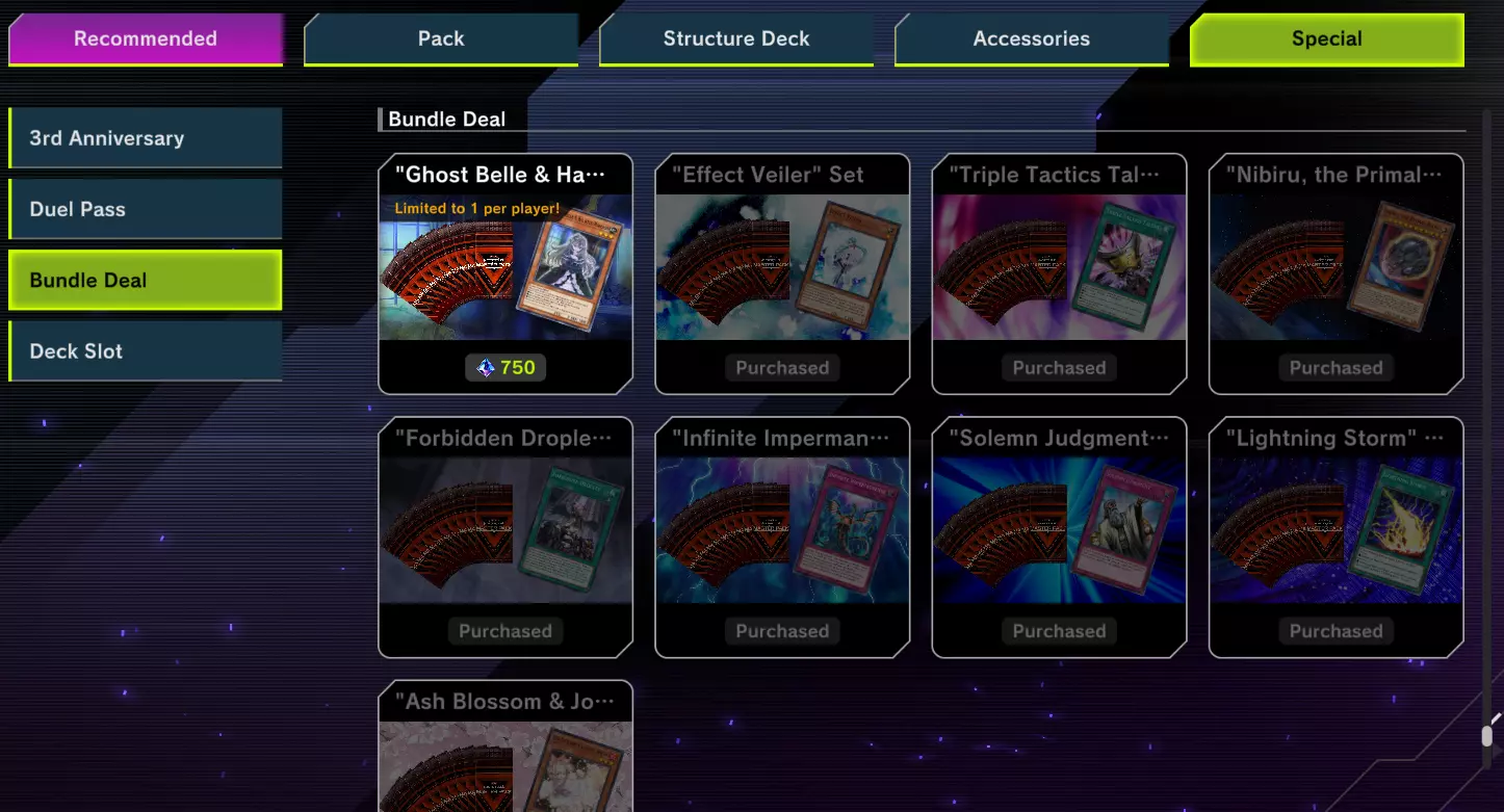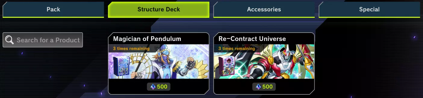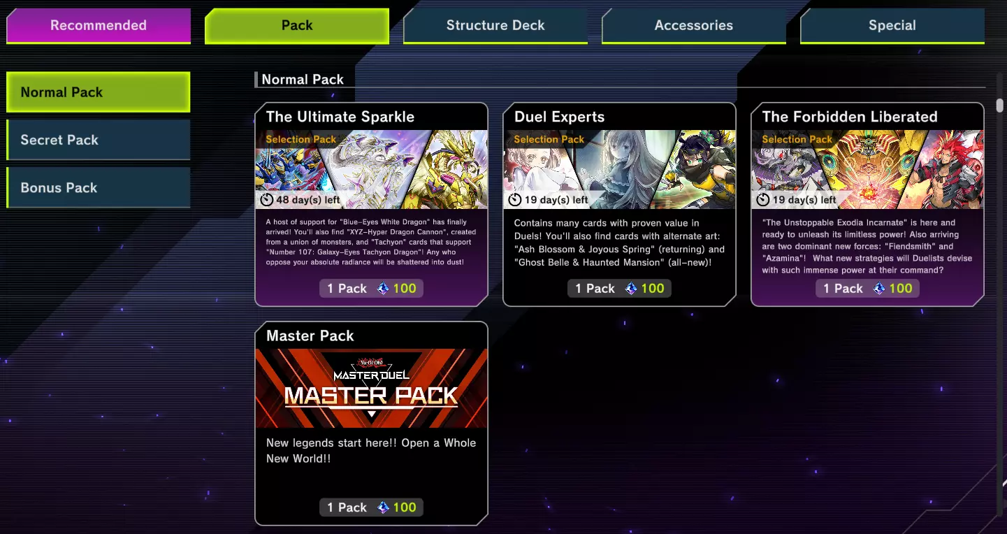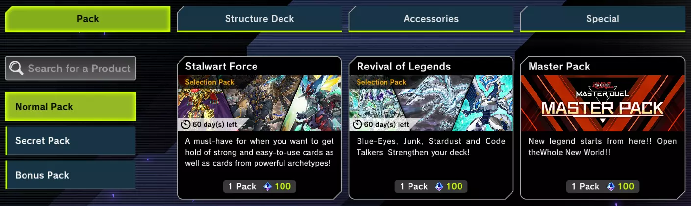 另一个有价值的物品是决斗专家卡包。该卡包包含大量各类常用卡牌,如果你正在寻找这些卡牌,它是最适合开的卡包。其中还包含部分卡牌的异画版本,这是个有趣的额外奖励。 遗憾的是,这个卡包仅在限定时间内可用。如果错过了,你将不得不等待科乐美再次上架,通常是在游戏王:大师决斗周年庆等特殊活动期间。