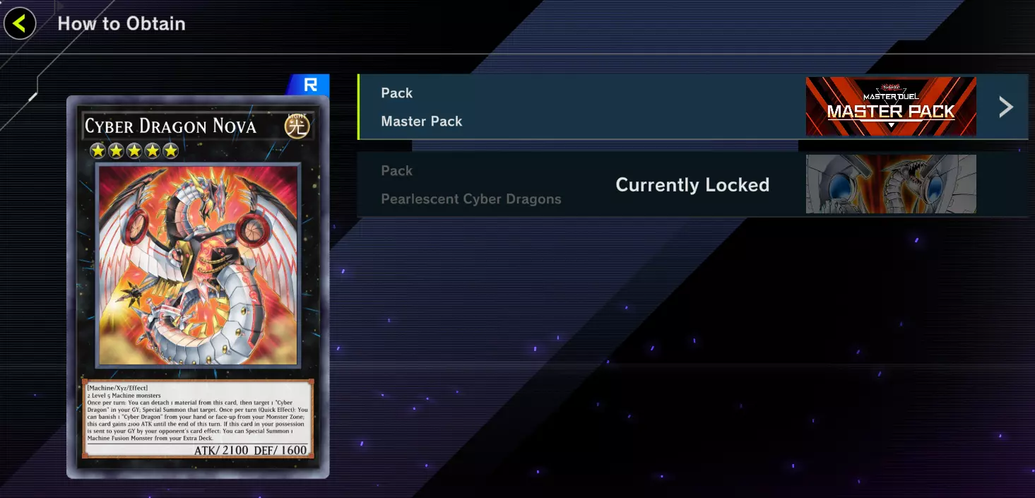 第一个答案是“不是大师包”。第二个答案将由卡片本身给出。假设我们想组一套电子龙卡组。我该从哪里开始呢?我们可以搜索该卡组中的一张卡,这里以电子龙·新星为例。在选中的卡片底部有一个“获取途径”按钮,会告诉你该卡属于哪个卡包。