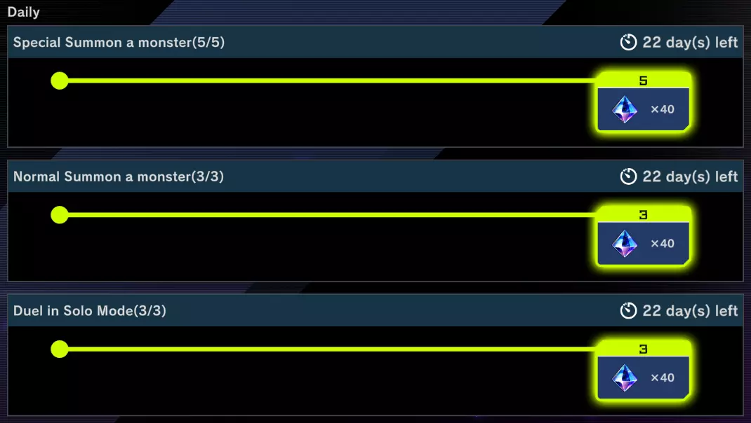 此方法我们只需利用每日任务。每日任务包括: - 进行3次通常召唤 - 进行3次特殊召唤 - 发动3张魔法卡 - 发动2张陷阱卡 - 进行3次仪式/同调/超量召唤 - 进行3次融合/灵摆/连接召唤 - 破坏5张卡牌 - 赢得1场决斗 - 在单人模式进行3次决斗 如果未完成每日任务,它们会累积,直到9个任务全部可完成为止。这正是我们想要的。 一旦拥有9个每日任务,就可以开始决斗了。根据你的卡组,可能在一两场决斗中就能完成3个以上的任务。 注意:这并不意味着必须等到有9个每日任务才能玩游戏,只是在集齐所有任务前不要领取任何奖励。关键部分:只领取你的卡组能够轻松完成的3个任务。 例如:我的主力卡组是【迷宫】,所以我可以轻松完成特殊召唤、陷阱卡、破坏卡片以及胜利任务。通常召唤和魔法卡任务对我来说比较困难,所以即使完成了我也不会领取。其他召唤任务对我的卡组来说是不可能完成的,所以我直接忽略,而单人模式任务是免费的。 额外提示:如果你不领取任务,所有任务将在月底重置,这就是每个任务上剩余天数计数器的作用。在最后一天领取所有已完成的任务以获得更多宝石,然后等待9个任务全部刷新后再重新开始这个方法。只完成这3个任务可以确保它们在下次每日重置(太平洋标准时间上午10:00)时再次出现,这样你就可以每天重复刷这3个任务。完成3个每日任务可获得120颗宝石(每个任务40颗)。现在我们只需要再领取另外两项奖励:每日登录和DUEL LIVE。