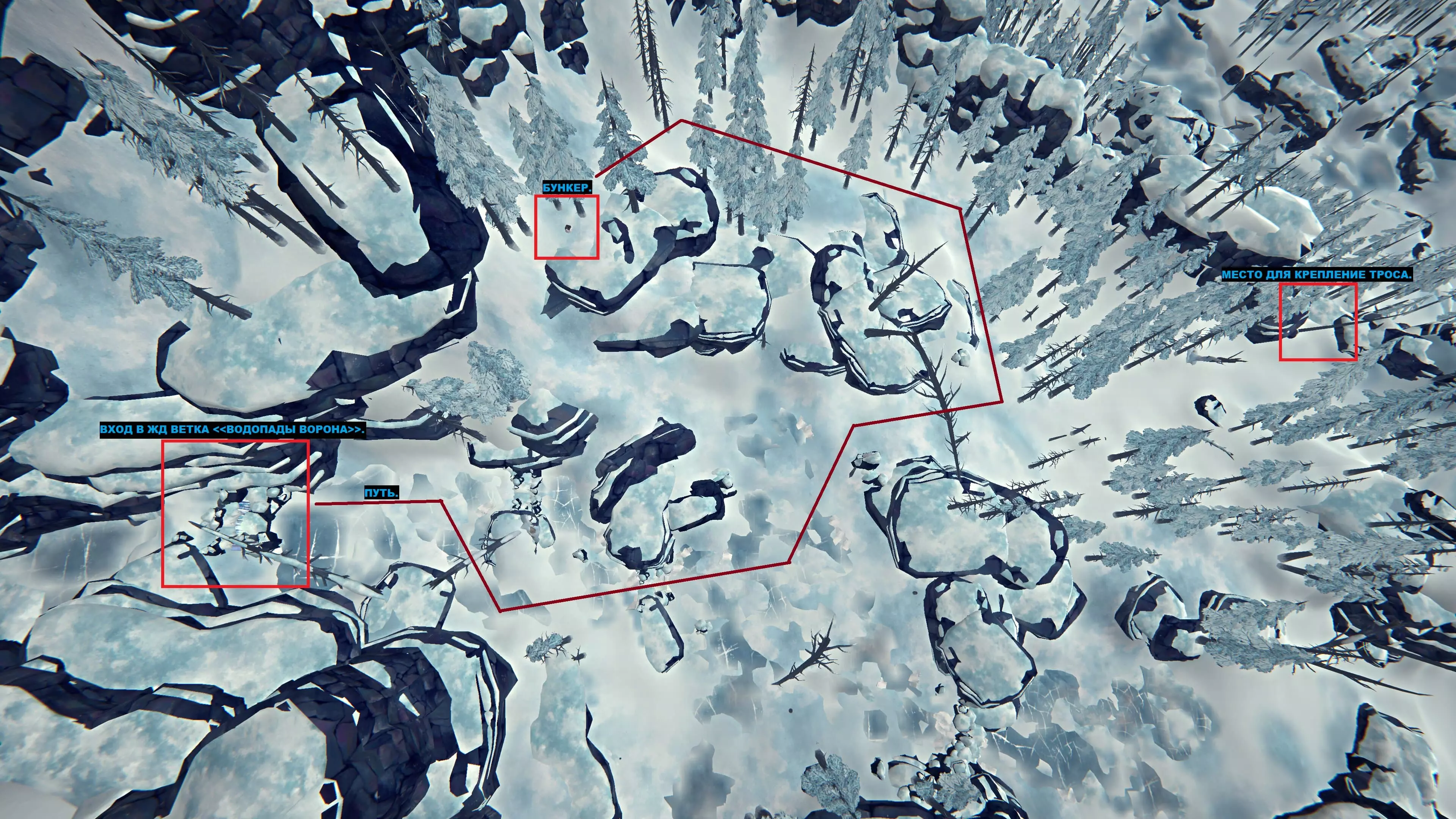 苍白海湾:从“铁路支线‘乌鸦瀑布’”一侧出发,向下走并直走到一棵呈拱门状的倒下的树。穿过倒下的树后,向左转到岩石后面,然后一直爬到高处。你无法从“孤独篝火”一侧爬上去,而且岩石上没有绳索。 地堡舱口的照片。