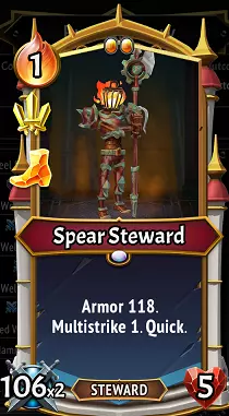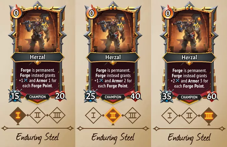 通常情况下,每消耗1点锻造点数用于单位/装备,锻造会为其增加+3攻击力和+3护甲(感谢用户The Ship Miner的纠正)。在【坚韧钢铁】的第一阶段,这些属性会降低至+1攻击力和+1护甲。 在战斗中,你通常会消耗锻造点数来召唤具有强化攻击力和护甲属性的单位,但这些通常是该场战斗的一次性增益。 【坚韧钢铁】意味着只要赫扎尔在列车上存活,锻造效果就会永久应用于卡牌。与剑姬的工匠效果或学舌男爵格雷尔不同,赫扎尔不需要处于发生锻造效果的楼层。 这对我意味着什么?这意味着【持久钢铁】是一种在卡牌上花费锻造点数时,对装备或单位卡牌进行永久性攻击和护甲投资的方式。随着第二级和第三级的解锁,锻造厂的护甲效果本身也会得到提升,从而更快地增加攻击和护甲值。因此,在我们的回合结束时,在泰坦之战结束后,我们的牌组中就有了这张【持矛管家】。