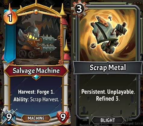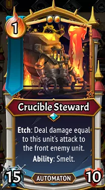 熔炉管家单位可以使用其“熔炼”能力,该能力能将卡牌的余烬费用转化为你的余烬和铸造点数。这意味着什么呢? Scrap Metal应被视为熔炉管家“熔炼”能力的【燃料】,后续卡牌如Salvage和Foundry Line亦是如此。你无需消耗牌组中的卡牌来使用“熔炼”,而是可以熔炼Scrap Metal,从而从该卡牌获得+3余烬和+3铸造点数。Scrap Metal会留在你的手牌中,等待你在回合中需要额外余烬和铸造点数时使用。需要注意的是,“熔炼”能力无需与Salvage Machine单位搭配使用,它甚至可以用于其他灾祸与枯萎卡牌,这非常棒!不过,废金属让这个双单位组合有了独特的搭配,能在战斗中生成大量锻造点数和余烬。氏族中的某个其他冠军可能也特别适合这些效果! 我应该不用熔炼就使用“废料收集”吗?可能不行。这张卡会留在你的手牌中,类似永冻,所以如果你故意不想抽牌,或许可以用它来“堵塞”你的手牌?否则目前来看,这个技能没什么太大用处,除非你在玩焰生氏族,以及他们那些因使用技能而获得加成的效果。锻造铁轨:赫扎尔的永恒钢铁 当你选择赫扎尔的【永恒钢铁】路线时,你可能会感到困惑,因为该路线的第一层提到了“改为”一词,尽管如果你阅读锻造工具提示,它似乎描述的是锻造通常的工作方式。
