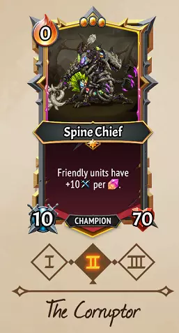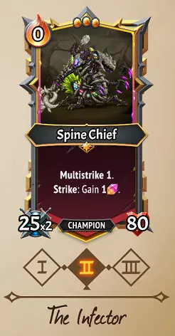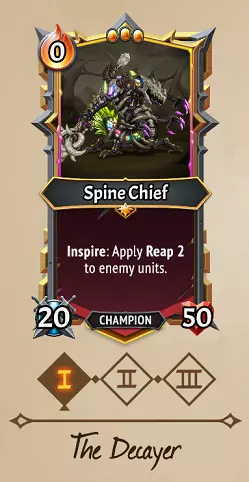 可以说,这是《怪物火车2》中最强的冠军/路线之一,但遗憾的是(但也可以理解)在三阶时被小幅削弱了。 策略:其机制与疯狂科学家奥雷奇非常相似。每当楼层添加回响时(通常通过灌注卡牌),脊椎酋长会让其楼层上的所有敌人都叠加收割效果。只要你的卡组有足够的灌注卡牌,就能轻松应对后排敌人浪潮,并且如果能叠加足够多的收割效果,也能对 bosses 造成巨大伤害。 组合:遗忘交易装备在这里表现出色,因为复仇触发会产生激励触发,从而带来越来越多的收割效果。无尽灌注单位和法术链灌注法术在这里非常强大。他与回响守护者是天生的搭配,能同时提供属性加成和收割效果。或者,和大多数流派一样,沼泽飞虫是不错的伙伴,因为在充满回声的楼层中它们能提升攻击力。在多个充满回声的楼层充能,也能最大程度发挥收割伤害的价值。 需要注意:虫卵会削弱收割伤害,所以可以考虑在其他楼层孵化它们,或者快速孵化,否则你的收割效果会微乎其微。如果你获得了横扫单位或强力范围法术,这里的协同效果就不大了,因为敌人可能在收割效果生效前就被击败了。 腐蚀者