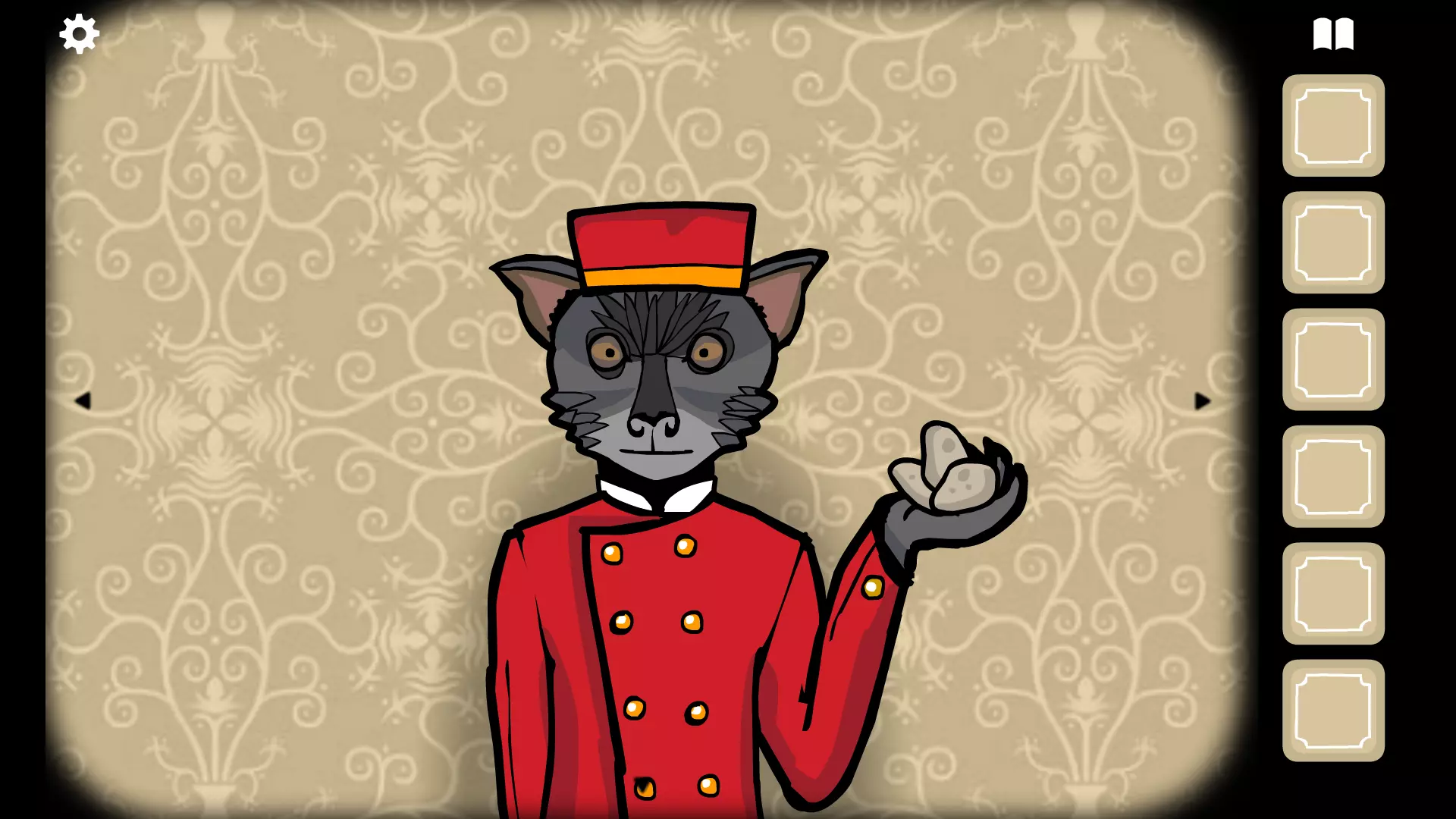 5号房间:鸽子夫人 食谱与食材:黑莓酱鸽子配土豆。 外部食材(可选):土豆。 主要食材:鸽子翅膀。 房间内食材(可选):黑莓。 获取食材方法: 土豆:可在第三个夜晚找到。当房间变暗时,若你向大厅的窗外望去,会看到一道明亮的白光落下。之后,蝙蝠先生会藏在屏幕左上角。点击他两次,然后再点击大厅的其他各个方向,直到他回到原来的位置。点击他,他就会给你土豆。