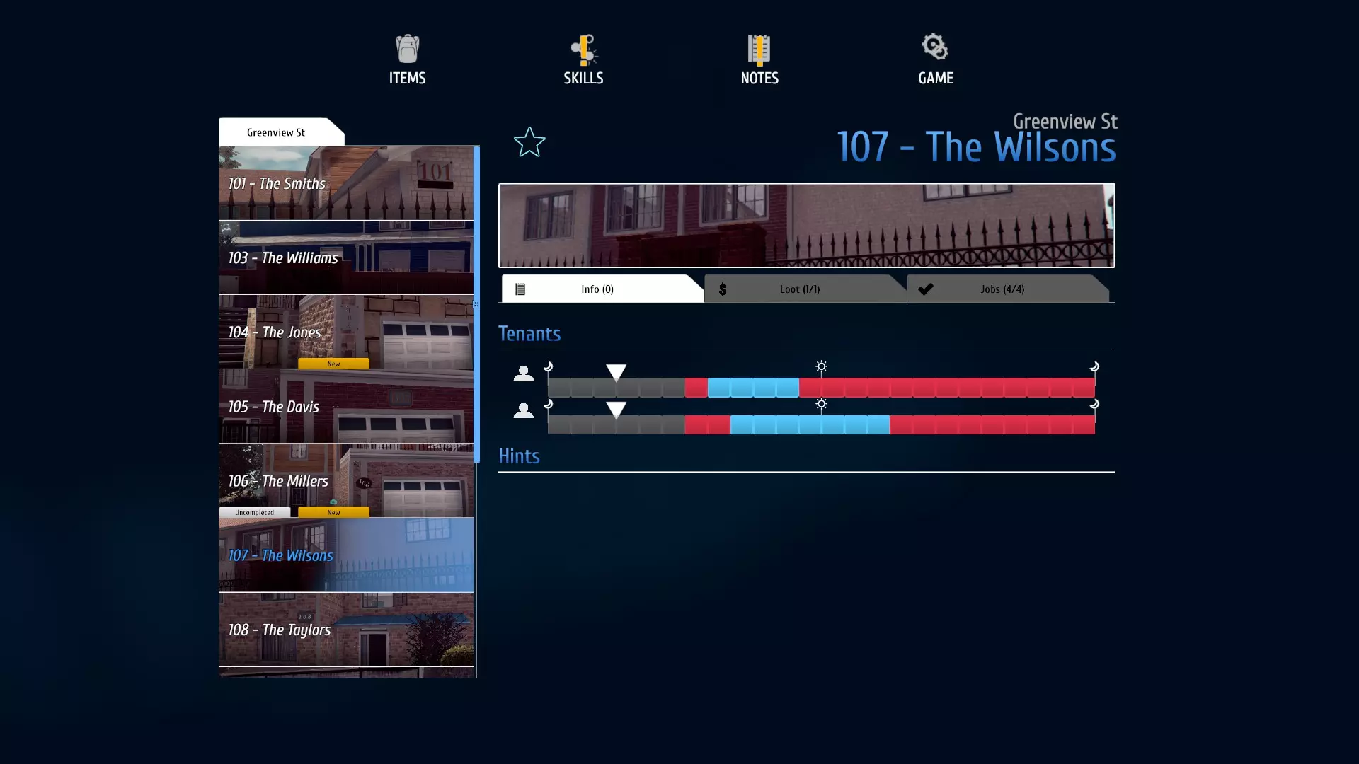 红色表示人员在家中(你可以选择每个时间段查看他们在该小时内的位置),蓝色表示他们不在家,灰色表示未知。根据这个图表,上午9点是准备开始闯入的好时机,因为那时他们都已离开,你可以有足够的自由来决定要盗取什么东西并将其搬到车上。 现在,如何进入呢?人行道上的前门有锁,可能会被人看到你试图撬锁。不过,如果你绕到侧面,那里有一个可以攀爬的格子架(需要敏捷1和攀爬手套),你可以翻过围栏,打破窗户进入。 抢劫的三个要点:抢劫 现在,我们来谈谈你此行的目的——获取那些诱人的战利品。但是,等一下,亲爱的。你可不能见什么拿什么,这可不是《上古卷轴5:天际》,你总不能每个口袋都塞500磅垃圾吧。 有些东西明显比其他东西更值钱,像玻璃器皿(比如花瓶)十有八九比那个平底锅值钱。话虽如此,如果能找到没见过的东西,你还是应该有意识地至少捡起一件。每偷到一个以前没偷过的新物品,第一次成功得手时获得的经验值是通常情况下的10倍。更容易解锁新技能意味着能更快获得更大的背包容量和更好的入室盗窃方法。 有意识地把车停在第三个R附近,我们马上就会讲到这个。 最后,把重的物品留到最后拿。这可能是你的重要检查项,但通常情况下,把东西直接装进口袋会更快,还能避免来回往返车辆的麻烦。 3R原则:撤退 你已经潜入进去,拿到了战利品,现在是时候撤离了。要记住,AI通常不会认为你的车“可疑停放”,除非它挡住了他们通常的行走路径或阻碍了交通,这种情况十有八九不会发生。 所以,只要条件允许,尽量把车倒到离前门或你的撤退路线最近的位置,同时不要妨碍行人通道。这样可以更方便地把大额现金物品扔进后备箱然后离开。如果房子里有人,一旦他们经过你偷来的东西,就会(神奇地)发现并报警。你进出房屋的速度越快,且不引起任何人注意,离开街区时获得的潜行经验值奖励就越高。 总结(目前) 以上就是我目前掌握的所有内容,如果你有任何意见或问题,请告诉我,我会在力所能及的范围内回复你。 进入/日常路线 在本节中,我将介绍我已知信息的房屋以及我通常的进入方式。我会跳过绿景109-111号房屋,因为它们是教程的一部分,进入方式应该非常简单明了。 我会按照从最简单的房屋(以这个 humble 的小偷的观点来看)到最麻烦的房屋的顺序进行介绍。前言:通常来说,给自己留出至少30分钟(游戏内时间)来逃跑是个不错的经验法则,这样能减少躲避警察的时间,如果你动作快的话,也有足够时间逃离附近区域。 格林维尤113号: 最佳潜入时间:上午9点(两名住户均外出,有5小时的 loot 时间) 重要 loot/信息:从房屋后方容易潜入,主卧衣柜里有一把吉他,在黑湾可卖300元;走廊和儿童房的路由器能卖个不错的价钱。主卧里还有一把前门钥匙,方便之后再次进入房屋。102格林维尤: 最佳潜入时间:晚上8点(1名住户在场,9点离开,有8小时的 loot 时间) 值得注意的 loot/信息:这是我在格林维尤最喜欢抢劫的房子,乍一看有点棘手,还需要玻璃刀……但如果你在晚上8点从卧室窗户进入,只有一名住户在场,且会在9点离开……之后你就有相当长的时间可以自由支配整个房子。前门钥匙在车库里,这样你就可以把车开到前门,从容地 loot,一晚上可以多次往返当铺重复操作。一定要记得拿游戏手柄,它们和对应的游戏机都值不少钱。