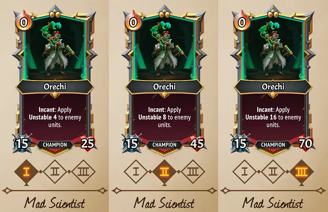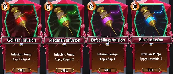 Mix effects & Infusions are an interesting addition to the game that add a lot of fun and chaos as you can develop gradually stronger Infusions to choose from. There is however, an interesting dichotomy here, because the base level effects of a single Mix (for the sake of argument, we’re considering this the use of a 1 Ember (C) Secret Ingredient spell card here) are actually weak by default. If you don’t believe me, consider what you can get from other clan cards that offer similar effects: Goliath (Red) Infusion gives 4 Rage. Hellhorned’s (U) Rage Serum gives 5 Rage for 0 Ember. Madman (Green) Infusion gives 4 Regen. Awoken’s (C) Wildwood Sap applies 4 Regen & +4 Health. Enfeebling (Purple) Infusion gives 1 Sap. Underlegion’s (C) Gooey Flask does 2 Sap to all enemies. Blast (Blue) Infusion gives 5 Unstable. Lazarus’ (C) Explosive Reaction gives 25 Unstable for 2 Ember. The point here is, from a “use an Ember to get an effect” standpoint, a standalone Mix is deliberately underpowered. However, those example cards are limited to those single effects, whereas a Mix can be any of these! Instead, it becomes about the flexibility these offer you, and the unique ability to hold these turn-over-turn, waiting for the right victim or ally to use them on. The only counter-argument I’ll make to this is Incant strategies… because Infusion counts as an Incant for 0 Ember, there can be some notable value in Injection weaker Infusions just for the free Incants. Some strategic musings for each Infusion type: Goliath (Red): Obvious use here is to simply add lots of Rage to your Attackers. However, in tandem with Lifesteal, this can be a great way to sustain your Tank units, particularly if you’re using traditional tanks (typically from other clans) that have big Health pools that will gradually dwindle. Damage Shields are quite powerful in this game, and can also be used here on your more vulnerable units either to stop them from being destroyed by Sweepers like Ragewing Assassins, or to eat the damage from Corruption ticks if fighting Seraph the Dominant or Qel the Corruptor. Madman (Green): Regen’s effects are fairly obvious here, but in my opinion, they pale in comparison to Reanimate, and even Spikes in the right situation. Spikes 3 isn’t much, but for a good chunk of the game, that alone is enough to defeat a wide variety of enemy backliners, and because this counts as Slay triggers, this can be used in tandem with Slay-trigger Champions, the Pyre of Savagery, or the (U) Organ Harvester Equipment. Reanimate is the big winner here though, as Reanimate effects aren’t guaranteed even when drafting Lazarus League’s cards, and the Reanimate 1 upgrade in Merchant of Steel is only useful on a couple units. However, increasing Reanimate stacks can be amazing for units like (U) Makeshift Golem who have Extinguish triggers, or for allowing friendly units with Unstable to continue blowing up, particularly (C) Overworked Assistant and Reanimator Orechi. Enfeebling (Purple): If you read the Underlegion guide, I repeatedly raved about how strong Sap is, and now I’m going to argue with myself because Sap 1 is not strong at all. Even Sap 2 is still pretty weak, so for the most part, we’re looking for those other abilities. Rooted is an extremely rare effect that will keep non-boss enemies in place, giving you another turn before they reach the Pyre. This can also stop a Collector from fleeing, and is a pretty helpful option for Mad Scientist Orechi, as it can give you more turns to Incant up the Unstable necessary to destroy a row of enemies. Melee Weakness is a very strong effect, allowing you to get some big hits on high Health bosses & enemies, or to allow your Pyre to make a quicker kill. Oddly, my favorite use of Enfeebling Infusion comes against the Titans fight, where the combo of Sap + Melee Weakness will make Dominion too weak to hit your Pyre, still give you a Pyre Light card (unlike Daze & Mute), and each stack of Melee Weakness increases your Pyre damage multiplier, allowing faster kills than usual. Blast (Blue): Theoretically, this is the weakest Infusion from the standpoint of rarity & potency of its effects, but in practice, this one gets a lot of use from us simply for how useful 5 Unstable can be. Early in the game, this result is a godsend, as a Blast Infusion destroys almost every single backliner in the game, even Cowering Sycophants because their Armor doesn’t count. Though 5 Unstable isn’t much, it’s still enough to defeat all levels of Collectors, works for mid-game enemies like Disciples of Ruin & Profane Supplicants, or even late-game ones like Ragewing Assassins & Purified Souls… particularly great because it’s not just defeating them, it’s also damaging the other enemies in the process. However, you needn’t only target enemies here, as you can put Unstable on your own units, either to gift some explosive potential to Reanimating units that don’t have it ((R) Nine-Lived Nightmare would love to explode for you!), to help destroy your own disposable support units like Assistants, Whelps, Imps etc., or to increase the potency of deliberately-Unstable allies like (C) Overworked Assistant & Reanimator Orechi. The 4 Damage effect is very weak and typically only used to defeat a weak unit with Unstable in order to immediately set off their Unstable explosion. Frostbite 6 is okay, it doesn’t really make a lot of sense with this clan, but is another way to either reduce their Health so the Unstable effect goes off, or to remove Reanimate stacks of obnoxious enemies like Undying Wretches & Deformed Duos. As a final note, for effects that Mix multiple times like Brewmaster Orechi, (U) Mixology, or (R) Mix-a-Lot, these effects Mix repeatedly without allowing you to play/Inject your Infusion in between. Thus these are typically much better if you have an Infusion of your desired Color in hand to strengthen that color repeatedly. Burning 3 Ember on Mi