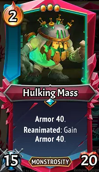巨型单位:这是一个真正庞大的坦克单位,巨型单位可嘲笑你弱小的护盾护卫,只需多消耗1点余烬,就能拥有总计60点生命值/护甲,更高的攻击力,以及一个能重置其护甲的复生触发效果。提醒一下,在钢铁商人商店中,重roll后必定会出现1级复生升级,这项超低成本的投资能让你获得一个总计100点生命值/护甲的单位。你需要坦克?这就是连坦克都想让它来扛伤害的坦克。 升级/搭配:理论上,你对巨型单位的升级方式应该与我之前描述的【U】临时魔像类似,但两者存在一些根本区别。与临时魔像不同,你并不希望巨型肉块被消灭,而且它额外的体型和余烬消耗使其作为无尽模式的选择不太友好。但和魔像一样,复生1和二元论是它的绝佳选择——这两个升级的组合会让巨型肉块在最终被击败前拥有高达260的总生命值/护甲,并且每多一次复生就会额外增加80护甲。其他不错的选择包括使用微缩石来缩小它的体型,以及典型的坦克友好型升级,比如泰坦石、心石,如果能装下或与微缩石配合使用,巨岩也可能是个不错的选择。