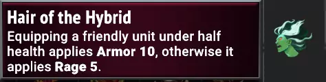 (+)总体来说相当不错!这使得任何嫁接单位生成时都带有狂怒状态,对双刃剑持有者来说尤其好用,也便于饥饿男爵格雷尔进行吞噬。这对多个单位来说都是不错的加成,也是受伤单位的良好保障,其最佳用途无疑是搭配多头蛇武装恐怖怪。