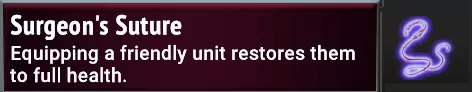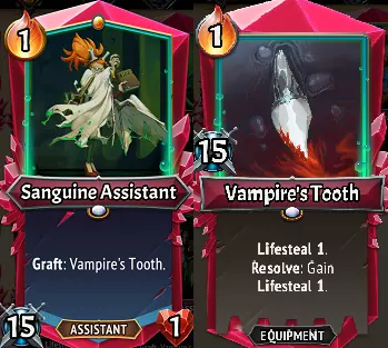 sanguine assistant/吸血鬼之牙(C):如果你需要证据证明嫁接装备是为其他单位准备的, sanguine assistant 应该能清楚地说明这一点,因为她从吸血鬼之牙获得的生命偷取对她1点生命值来说没什么意义。这是一件很棒的装备,可以用来治疗你的肉盾型坦克,也可以用来治疗像“主宰者塞拉芙”受到的腐蚀伤害。奇怪的是,因为她默认装备了牙齿,你只需要一块大宝石就能让她成为一个不错的坦克……她将拥有51点生命值,攻击时偷取30点生命值,并且只占用2个空间。