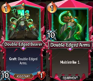双刃剑持有者/双刃剑武器(R):其稀有是有原因的,它能为另一个单位赋予多重打击(并提升10点攻击力),这对游戏中许多单位和英雄来说都是极大的增强。如果出现这张卡,通常是必拿的。即使你暂时没有能利用它的单位,也要知道这是一个1灰烬1空格的单位,默认拥有2次10点的攻击,这意味着你可以通过给它升级攻击力,让它进行攻击而不是为了嫁接效果而被摧毁,从而获得不错的输出。 提醒一下,无尽升级对上述单位来说并不好,除非你极度需要一个炮灰阻挡者,因为没有嫁接装备的它们表现相当糟糕。我已经提到了其中一些单位的潜在替代升级方案,因为通常情况下,你的目标是:放置它们,进行炮灰阻挡攻击,并将它们的【嫁接装备】捐赠给其他需要的单位! 你的楼层可能并不总能及时让这些单位被击败,所以要记住,你可以使用【法术卡】(例如(U)精准打击)在每回合击败多个单位,或者使用【爆炸注入】/【不稳定】效果来击败它们。【河豚血肉】是个例外,因为它默认的【嫁接生命值】为11。