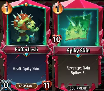 【河豚肉/尖刺皮肤】(U级):有趣的是,这是当前游戏中唯一具有防御特性的【嫁接单位】,其触发【复仇】效果需要该单位受到攻击。因此,这个单位只能算“还行”——虽然能提供一些尖刺伤害,但从提升游戏进程的角度来看,它是所有【辅助效果】中最弱的。它在对抗【熵之炽天使】时表现最佳,因为即使只有1点尖刺伤害,也足以击败烦人的【净化之魂】敌人。由于它体型小、成本低,且默认拥有【尖刺皮肤】,你完全可以通过【大块石头】等升级将其用作坦克。