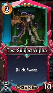 测试对象阿尔法:3点烬能,我是用烬能做的吗?哦抱歉,这是迅疾和横扫兼具?那继续吧!测试对象阿尔法(以下简称TSA)是一个使用起来极其简单的单位,即便属性不佳,也能解决游戏中大量难题。危险的横扫敌人、净化之魂这类玻璃大炮威胁、震耳传令官之类烦人的沉默单位?在它强大且迅捷的……翅膀面前,所有这些都能轻易被击败!TSA是简化你游戏流程中难题的绝佳选择,尽管其烬能消耗较高。 升级/搭配:和大多数横扫单位一样,它初始5点的攻击力低得可怜,亟需力量石和巨力石来提升。由于拉撒路联盟提供了大量装备卡来增强TSA的进攻能力,而且复活的敌人能够承受一次攻击,所以多重打击是非常值得的升级。我最喜欢的搭配是(C)扭曲助手,其扭曲背部装备能在攻击时同时提供狂怒和践踏效果。横扫攻击对所有敌人都算作“攻击”,这能让TSA快速积累大量狂怒,并通过践踏溢出额外伤害。总体而言,装备卡是提升他进攻或生存能力的好方法……考虑到他容易触发击杀效果,(U)嗜血之刃和(U)器官收割机等装备就能很好地发挥作用。 拉撒路联盟旗帜单位:稀有 稀有(R)旗帜单位: