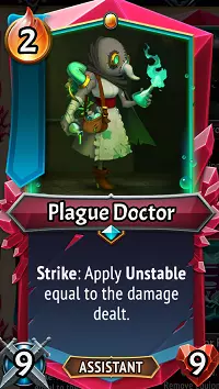 瘟疫医生:是拉撒路之旗所有单位中唯一的人类角色。她有一个有趣的技能:她造成的任何伤害都会为受害者叠加等量的【不稳定】效果。以她基础9点的攻击力来看,这可能不算什么,但当你提升她的攻击力后,情况就大不一样了——无论是通过【狂怒】、装备卡牌、无氏族房间(U)的【搏击俱乐部】、【钢铁商人】对她的直接升级,还是与能提升攻击力的盟友搭配。尽管她需要2点【余烬】,但她的【通用体型】让她能轻松融入你楼层的后排。与不稳定状态部分所述类似,请注意,她施加不稳定状态时,对生命值较低、可被击败并引发爆炸的单位通常效果更强,而非攻击高生命值的肉盾单位。我们非常喜欢这位可爱的女士——她的烧瓶在获得些许支援后,能引发强大的连锁反应! 升级/搭配:提升攻击力是初期的简单选择,无论是通过力量石、速度石,甚至是大宝石。多重打击也相当实用,可让她每回合发动多次带有不稳定状态的攻击。无氏族(U)装备铁舌对她而言效果显著,能立即将其攻击力提升至30,并让她对整层敌人造成横扫+不稳定状态伤害。如果你通过速度石或【迅捷钢匕首】(U)使她获得先攻状态,当你能攻击前方低生命值敌人时,会有一个有趣的伪清场技巧……比如,使用【肉钩】或【天堂之息】神器将一名脆弱的治疗者推到前排。由于她拥有先攻,若你的瘟疫医生有33点攻击力,她会立即攻击那个脆弱的治疗者,这不仅能击败对方,还会触发其不稳定爆炸,对所有敌方单位造成33点伤害!通过装备、房间、怒气和攻击加成等任何机会,利用她引发强力连锁反应。