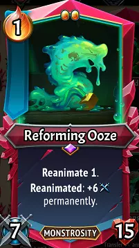 变形软泥:这可真是有点滑稽。作为疯狂科学家阵营对抗熔渣残党【R】悬赏追猎者的对策,变形软泥最终会成为强大的进攻威胁,但前提是它能被反复击败并复活。它默认自带1次复活,因此每场战斗至少触发一次效果相当容易……实际上,乐趣在于尽可能为它堆叠复活次数,让它在战斗中反复死亡以强化自身。由于需要投入资源培养软泥才能获得理想效果,所以它并非出现时就必须选择,若配合奥雷奇和混合卡牌,使用狂人【绿色】注入来早期增加复活次数,其效果无疑会更好。升级/搭配:多重打击将是最有帮助的升级,能充分利用你投入的攻击属性。从钢铁商人那里再获得1点复生是个不错的选择,但如果有机会,我更倾向于无尽,因为它能让你在战斗中多次触发效果,必要时还能作为炮灰阻挡。【器官采集者】装备非常适合它,因为它最终会足够强大,能获得自己的复生层数,进而转化为更多的攻击加成。房间卡牌【复生实验室】也很不错,尤其是当它被赋予无尽效果时,可以反复召唤并复生,同时获得属性加成。如果你看到“复生”这个词,一定要去获取它!
