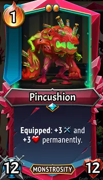 针刺玩偶:这是拉撒路阵容中严重依赖一名英雄(巴伦·格雷尔)的单位。每次为针刺玩偶装备一件装备,它就会获得+3/+3的永久属性加成,在整个回合中逐渐增强其攻防能力。由于在拉撒路联赛中,通过嫁接单位可以更频繁地获得装备,因此它具备在每场战斗中潜在获得数十次永久属性提升的独特能力。这些加成能让你根据回合需求灵活地将其用作坦克或伤害输出者。不过,需要特别注意的是,将它与巴伦·格雷尔的【不稳定助手】技能搭配使用时,相比奥雷奇,每场战斗可能会获得+15/+15的属性提升,因此在这两者之间选择的话,结果相当明显。升级/搭配:由于生命值和攻击力提升幅度相同,你可以根据喜好选择发展方向。可以添加【大晶石】、【泰坦石】和【无尽】等升级,使其成为一个强大的肉盾坦克;或者添加【速度石】和【多重打击】等升级,发挥其进攻优势。但最重要的是,只要有机会就对其进行投资。尽可能为它装备【剪刀手】(此路线与【巴伦·格雷尔的学习肢体】和【它渴望】路线配合更佳,与【活体军械库】存在一定反协同),如果没有【不稳定助手】,则寻找其他【嫁接】单位和装备卡牌,反复为其加载增益。最后,在游戏后期如果出现【针垫】选项,建议不要选择,因为你可能没有足够的时间提升其属性,使其值得投入资源。