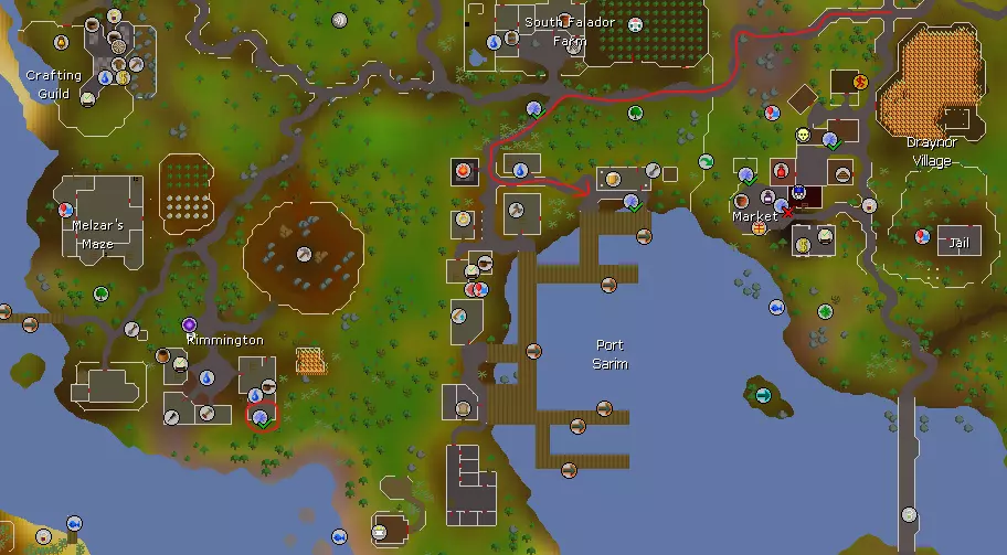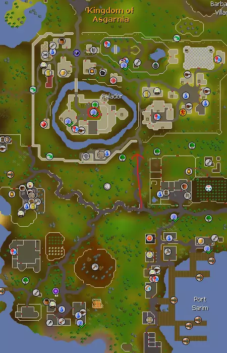沿着法尔茅斯向北走,然后向东转。你会经过蛮族村,那里有安全要塞的入口。 沿着这条路最终会到达大交易所。花点时间了解大交易所是什么以及它的运作方式,还有所提供的物品。另外,和大交易所外的詹姆斯谈谈,了解老派 bonds。 购物与任务 以下是一些你可能需要购买的任务物品: 完成“小鬼捕手”任务所需的红、黄、白、黑四种珠子。 完成“多里克的任务”所需的物品。 完成“哥布林外交”任务所需的蓝色和橙色染料。以下是你在城镇中可以做的一些有用的事情: - 罗密欧与朱丽叶任务可在法尔科克城内完全完成,能获得大量任务点数。 - 地图上的圈出区域是你需要交谈的图书管理员位置,以便推进骑士之剑任务。 - 你可以在这里开始并完成大部分的恶魔杀手任务。 - 前往蓝月酒馆打开海盗宝藏任务中的那个宝箱。 - 在酒馆时,与哈洛医生谈论吸血鬼杀手任务。 需要记住的是,你之前购买的编年史在需要购买更多传送卡之前,可以将你传送到法尔科克附近12次。我建议你在花光卡片之前,先花点时间在这附近赚些钱。说到钱…… 赚钱方法 对于新手玩家来说,法尔科克地区有很多赚钱的途径。我会在这里介绍几种方法。 采矿