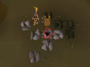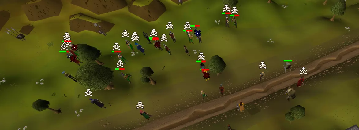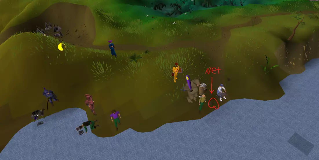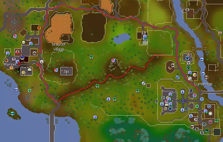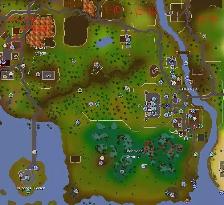 力量、攻击、防御、远程和魔法的1-10级最好在鸡身上训练。鸡不会杀死你,它们会掉落生鸡肉、骨头和羽毛。羽毛只占一个背包格子,之后可以用于蝇钓。 捡起所有的羽毛、骨头,或许还有生鸡肉,直到背包满了为止。背包满了之后,把骨头存到银行里,并烹饪你拥有的所有鸡肉。 你的目标是在银行里存25堆骨头,留待日后使用。达到这个目标后,你可以开始埋葬骨头来获取祈祷经验。你可能还需要一些熟鸡肉,以便在10级到20级训练时恢复生命值。 10-20级的战斗技能可以在牛身上训练。要小心,如果你不注意的话,它们可能会杀死你。奶牛也会掉落骨头、牛肉和牛皮。牛皮可以存入银行,之后出售换取一些现金。 需要注意的是,远程武器(如弓箭)和法术可以用来攻击躲在栅栏或岩石等低矮物体后面的生物,如果这些生物自身没有远程攻击能力,它们就无法反击你。这被称为【安全点】。 如果你觉得特别有冒险精神,可以尝试去南边的卢米埃奇沼泽训练。那里的生物可能很危险,而且掉落物也没什么特别之处。 捕虾人 在前往任何真正危险的地方之前,你会想要一些更好的食物。而获取大量免费优质食物的最佳方式莫过于钓鱼技能了!现在该和冒险家乔恩谈谈他的采集路线了。和他对话后,把背包里的所有东西存入银行,但可以留下几根原木和一个火石盒(如果你想获得更多烹饪经验的话)。然后沿着路向南穿过卢米bridge墓地。最终你会到达这个地点: