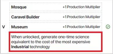 第二和第三科技加成 - 大本钟 完成伊斯兰教后,你现在拥有足够的科技来研发工业时代的第一个科技。 选择【资本主义】