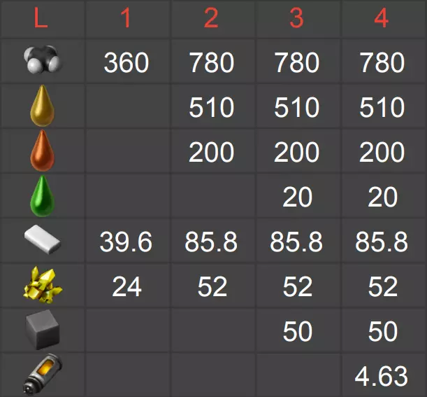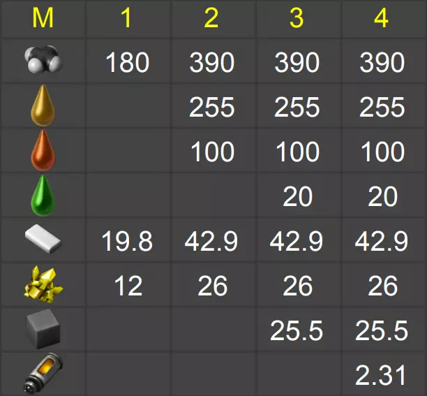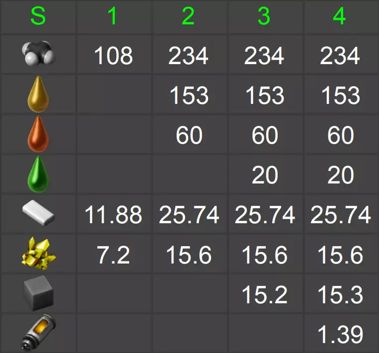 重要提示:表格中显示的是各组件的单独生产情况。部分零件会消耗相同的资源,因此在不同情况下,你的工厂可能会减少特定资源的产量! 上方行中的数字表示生产阶段。 资源旁的数字表示每秒的产量。 表格中未列出石油和水的消耗量。
