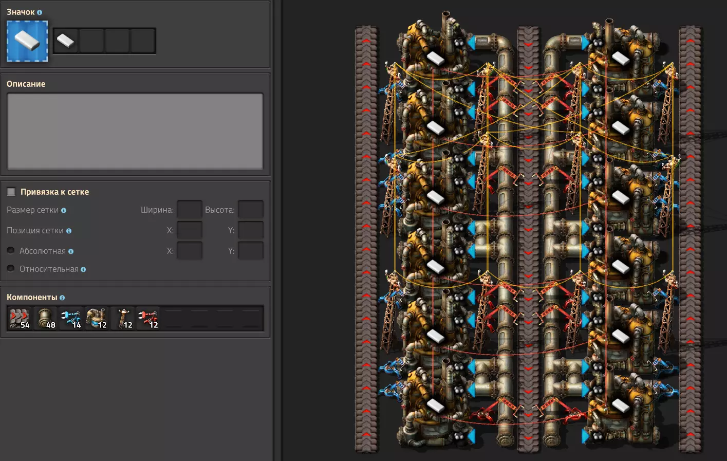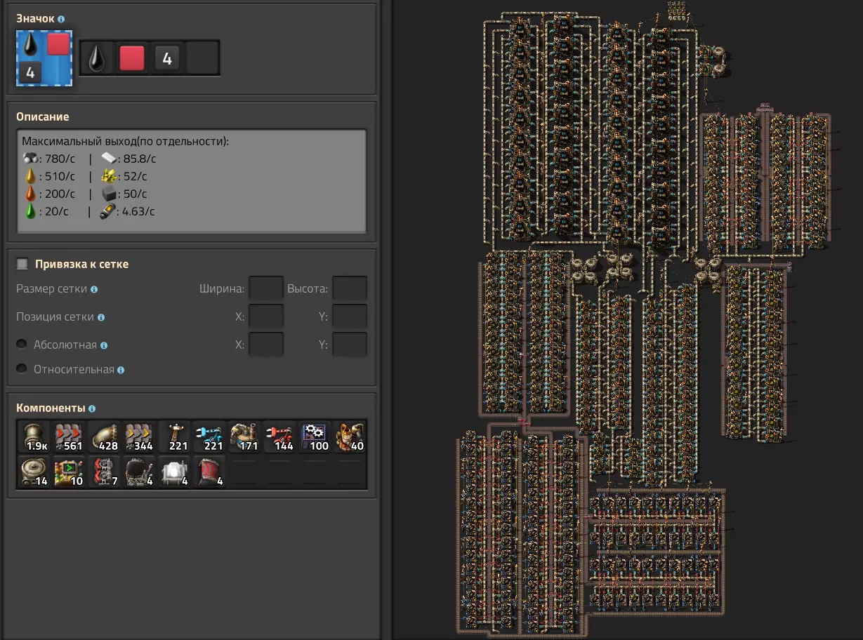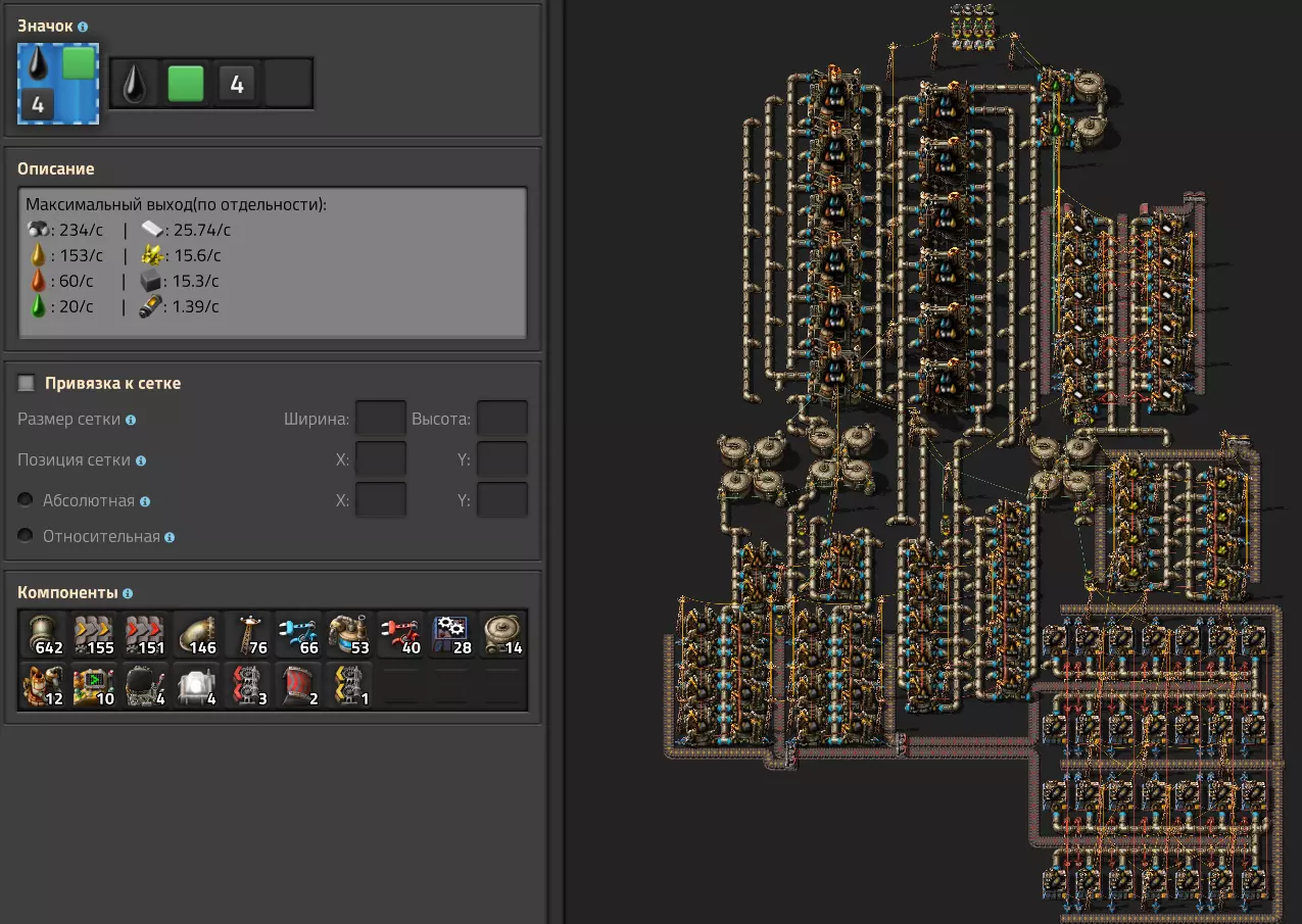 工作特点 组合蓝图分为3种类型,各包含4个阶段。 颜色代表类型:绿色-小型,黄色-中型,红色-大型 数字代表阶段。这部分无需过多解释,只需说明在放置1阶段蓝图前,需确保该位置在升级后能容纳工厂的最后阶段。 每个组合蓝图都有开关,用于控制特定资源的生产。遗憾的是,开发者没有给我们带来拉杆,所以我用组合器代替了它们。