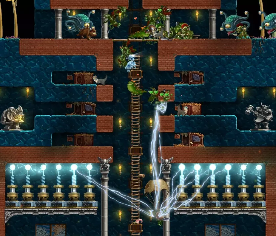 如果他生气了,会用拳头猛击地面,将其变成沙子(仅对泥土有效,岩石或墙壁不受影响)。因此,当你开始这个世界时,要留意祭坛的位置。如果祭坛离你的营地太近,建议重新开始以获得更好的位置(最好尽可能靠近地图边界),以防万一你惹恼了他,更重要的是避免在狩猎或对抗入侵者时意外攻击到他的萨满。萨满本身相当强大,他会召唤兽人、哥布林,使用火球术,极难被杀死,而且还会重生。 你只需像在庇护所放置物品一样,将物品放在祭坛上即可进行供奉。一旦物品放在祭坛上,就无法取回,而且祭坛上只能容纳部分物品,所以要明智选择。那为什么要这么做呢?如果他喜欢你的祭品,就会扔出银币、金币甚至秘银,所以这基本上是一种把廉价物品变成贵重矿石的方法。 他喜欢什么?根据经验,最好给他你已经用不上的东西,比如当你能制作铁镐时就给他石镐,以此类推。他也喜欢家具,我曾通过给他5-6个窗户或花坛获得过不错的结果,而且他似乎真的很喜欢哥布林长矛和水晶。但你越往后发展,他就会变得越挑剔、越难满足。 如果祭坛上的灯变成橙色,说明他对你的祭品感到愤怒;如果是白色,说明他持中立态度;蓝色则意味着你会得到奖励。 我没测试过,但有人提到如果多次惹他生气,他就不会再回来了。敌人 怪物传送门 与之前世界的最大不同在于,这次传送门出现在浮空岛的高处——眼魔和石像鬼会飞下来,而兽人、洞穴野兽和哥布林则会使用降落伞和梯子。因此,你最好调整之前的防御思路,以应对从上方来袭的怪物。对我来说,建造一个金字塔状结构效果很好,顶部附近设有入口,一条通往仓库的通道两侧部署着特斯拉塔和宠物。