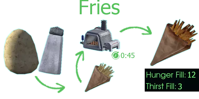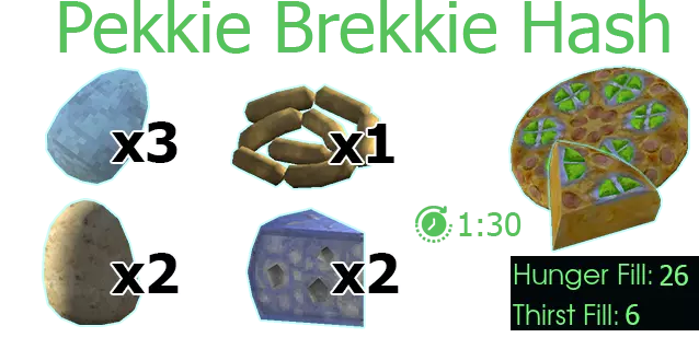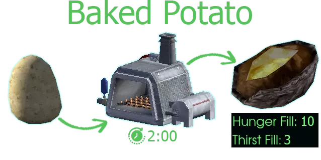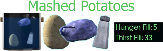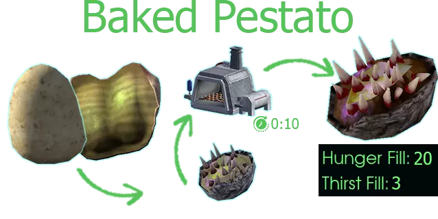 用途:蔬菜炖菜/土豆香肠炖菜/土豆泥、灰叶杂烩、烤土豆/烤 Pestato/薯条、 Carbuncle casserole、 Pekkie Brekkie 杂烩、Pest 土豆派 获取途径:特定冰箱(西 manufacturing 区)、种植 【土豆】