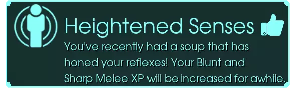 敏锐感知 - 你最近喝了一碗能提升反应能力的汤!你的钝器和锐器近战经验值在一段时间内将以更快的速度增长。