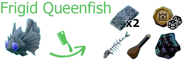 冰冷女王鱼 2份冰冷女王鱼排、鱼骨、鱼油、黑色黏块、皇家硬币(稀有)