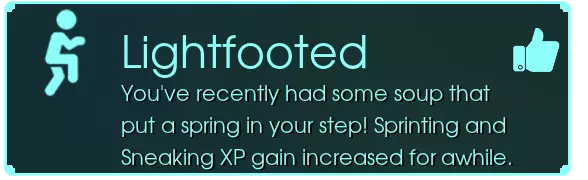 【轻盈脚步】- 你最近喝的汤让你脚步轻快!冲刺和潜行经验值获取在一段时间内提升。