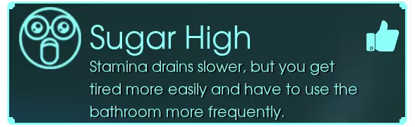 【糖分过高】- 耐力消耗变慢,但更容易疲劳,且需要更频繁地上厕所。