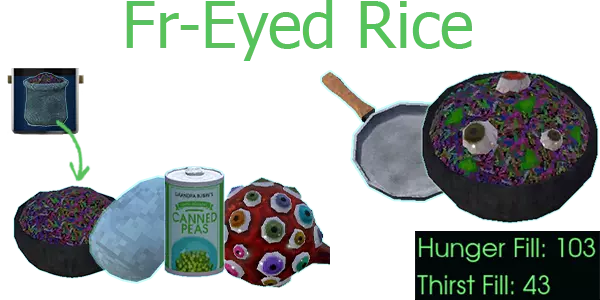 【油炸】焦眼炒饭 材料:一碗赞特瑞姆米饭、“鸡蛋”、一罐豌豆、格雷耶布 效果:施加【颗粒视觉】-水下视觉