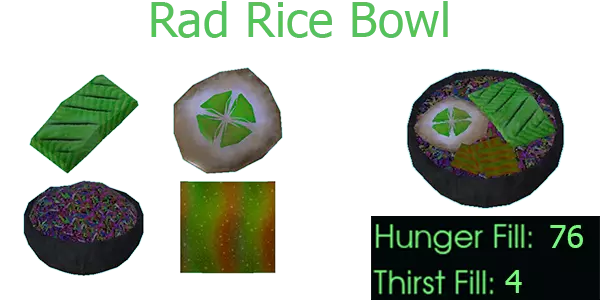 辐射饭碗 烹饪过的辐射鱼排、赞特里姆米饭碗、烹饪过的“煎蛋”、烤海苔零食 应用【辐射抗性】——减少50%辐射吸收