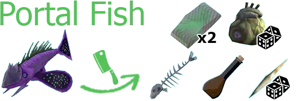 传送门鱼 2份传送门鱼片、鱼骨、鱼油、埃克索尔羽毛、埃克索尔之心(稀有)