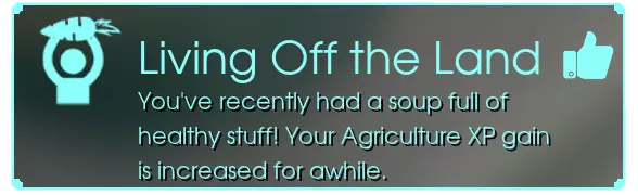 "靠山吃山 - 你刚刚享用了一碗营养丰富的汤!你的农业经验值获取率将在一段时间内提升。"