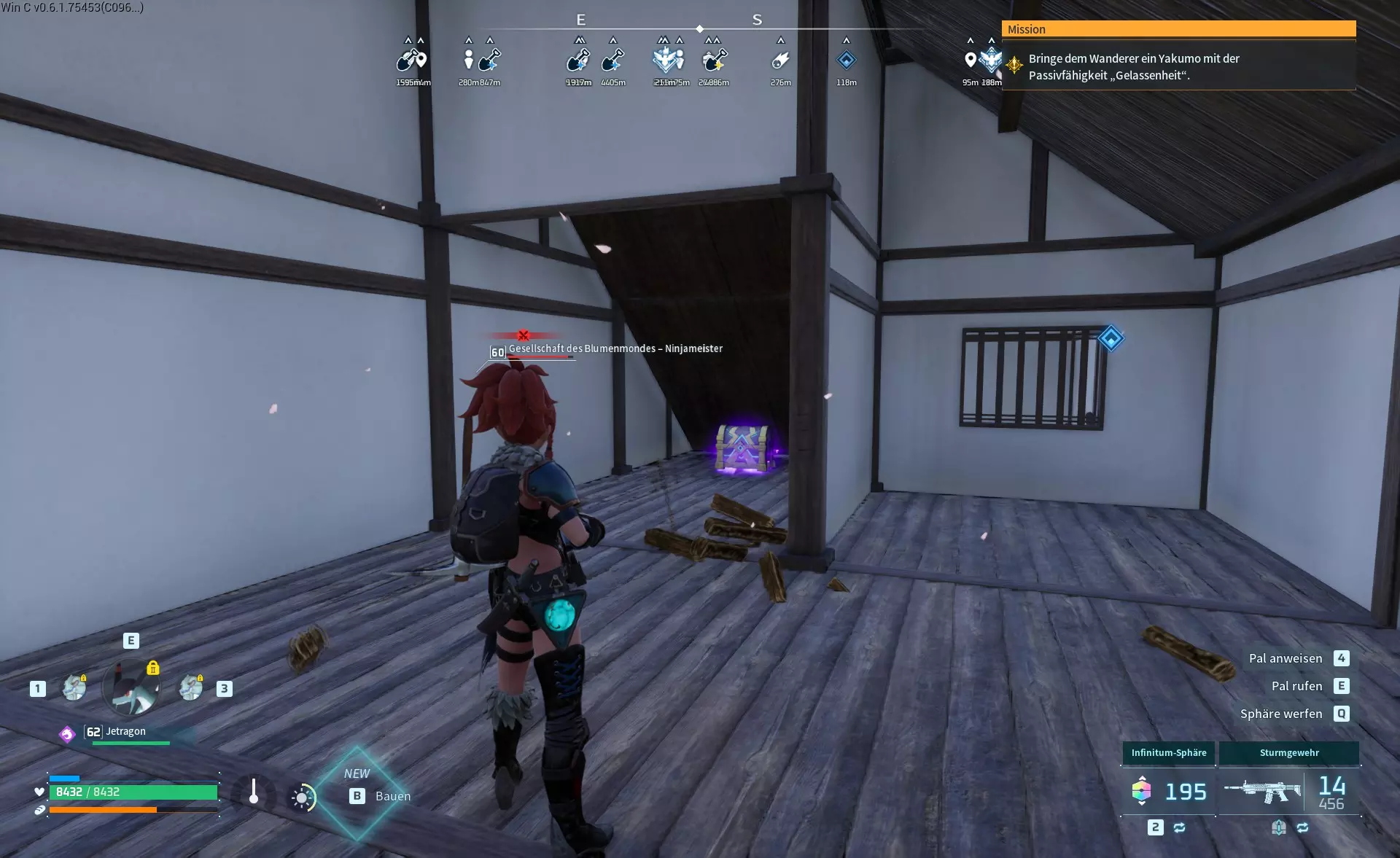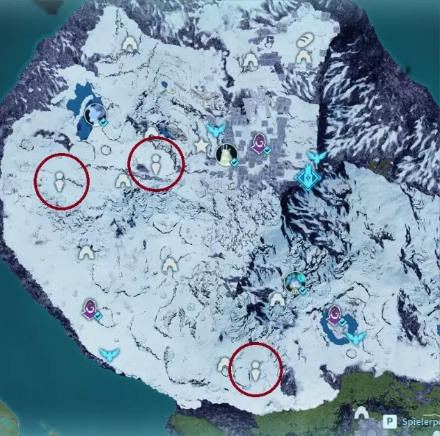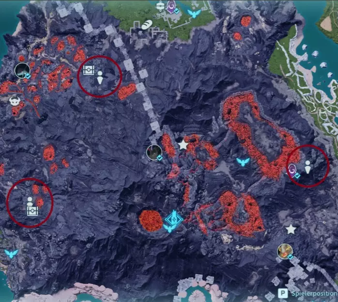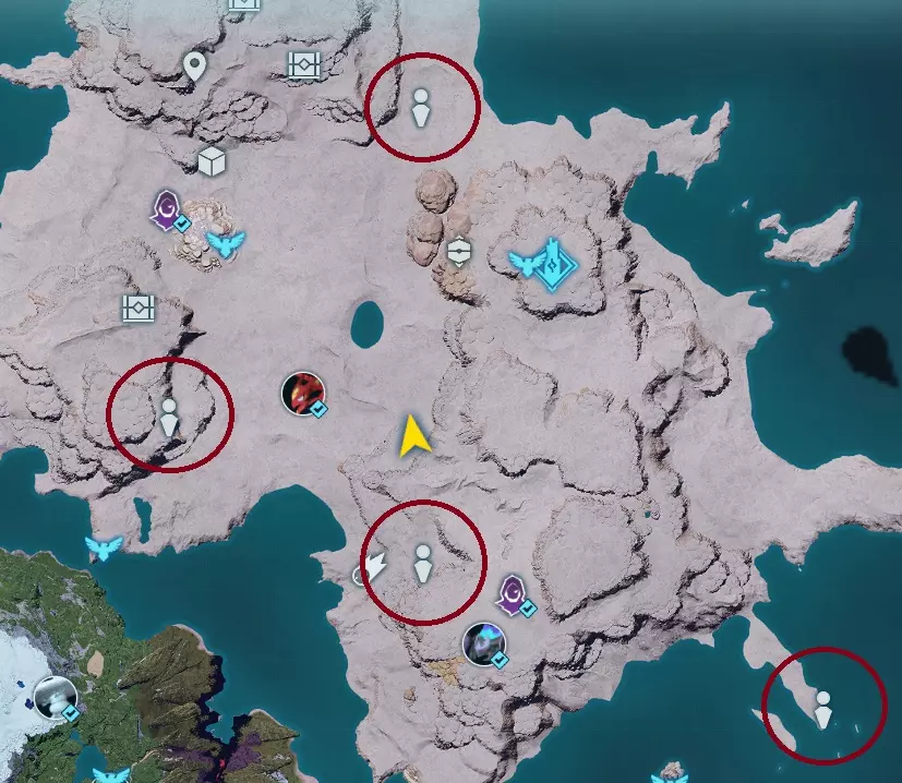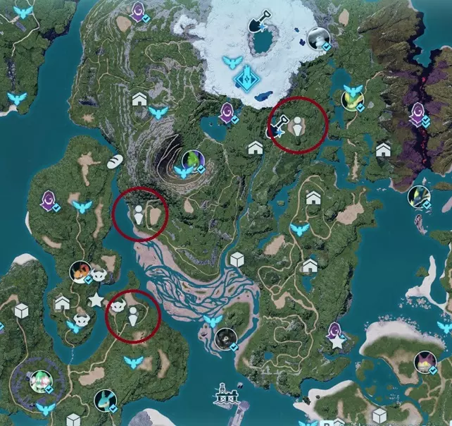 该阵营在中间岛屿有许多可能的基地位置。此外,它与简易营地共享刷新位置,这些简易营地只刷新一个装有帕鲁的笼子,没有宝箱。 我观察到各种位置,有时会刷新营地,有时会刷新基地,但这似乎相当随机。我用立方体标记已发现的营地,用不同的标记标记已发现的基地,因此红色圆圈是我可以确认有基地刷新的位置,而橙色可能是可能的位置,但我尚未看到基地在那里刷新。 基地类型1