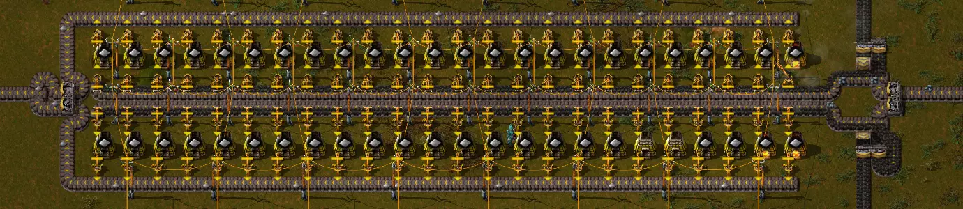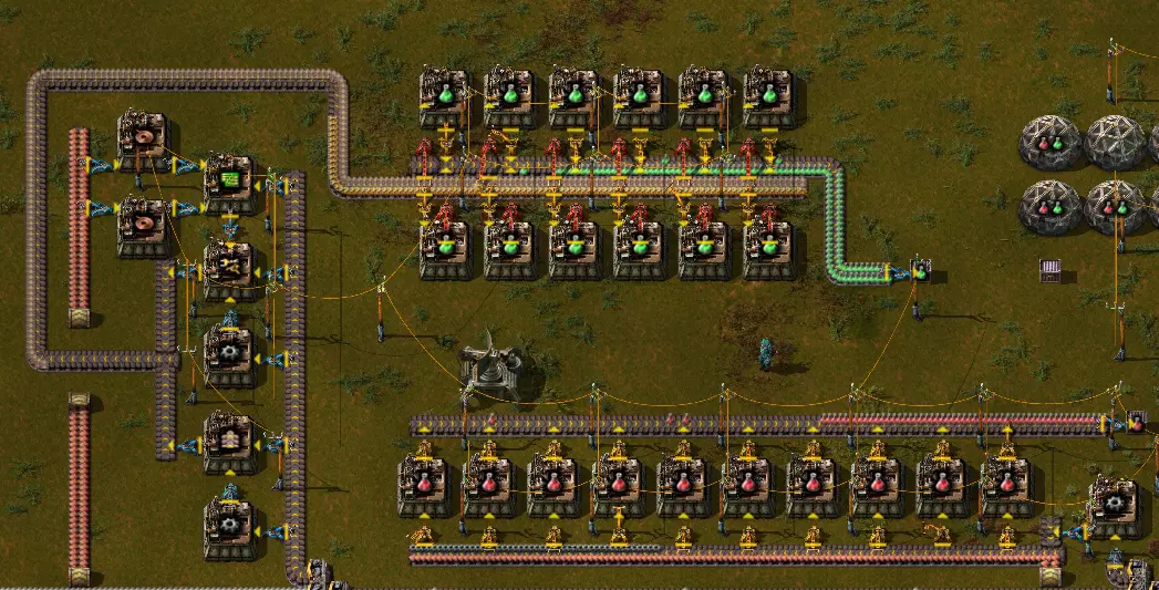 设计一个完全高效的布局相当繁琐,但结果却无可挑剔。 示例:早期游戏科技 红色科技是最容易实现自动化的。红色科技配方需要1个铜板和1个铁齿轮,制作时间为5秒。考虑到这一点,你可以直接将铜板输入其中。铁齿轮的制作时间为0.5秒,这意味着1个齿轮组装机可以为10个科技组装机提供足够的齿轮,从而使科技产出达到2个/秒。 绿色科技则更为复杂。不过,它的所有原料都能在0.5秒内制作完成,且由于其配方制作时间为6秒,因此可以放置12个组装机,同样能达到2个/秒的产出。只需为输入端配备合适的传送带和 inserter 工厂即可。