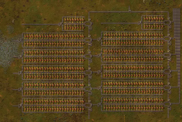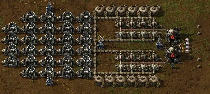 只需添加一些储罐来储存蒸汽,并编写节流逻辑,这样就可以了。 额外提示: 一个离岸泵每秒产生1200单位水。 一个热交换器最多可使用103单位水。 这意味着1200除以103约等于11,即一个泵在满负荷下最多可供应11个热交换器。 有时不必过于纠结: 有些东西确实不需要这种级别的精度,例如石油加工,其通常依赖过量生产来裂解三种产出,这是一种足够好的做法。 其他例子包括间歇性使用的产品,如弹药、装甲或载具。在这些情况下,比例是否完美影响不大,所以只需放置一些装配机,然后放宽心就好。 但为什么呢?学会独立建造工厂是提升游戏水平的关键环节。使用蓝图会让你错失游戏的一大挑战,这对新手尤其不利,他们将无法学会如何建造工厂。但最重要的是,自己摸索解决问题本身就充满乐趣,每一次建造都会带来成就感,胜利也因此更加令人满足。当然,这可能会很困难,但正是这种困难让一切变得值得。