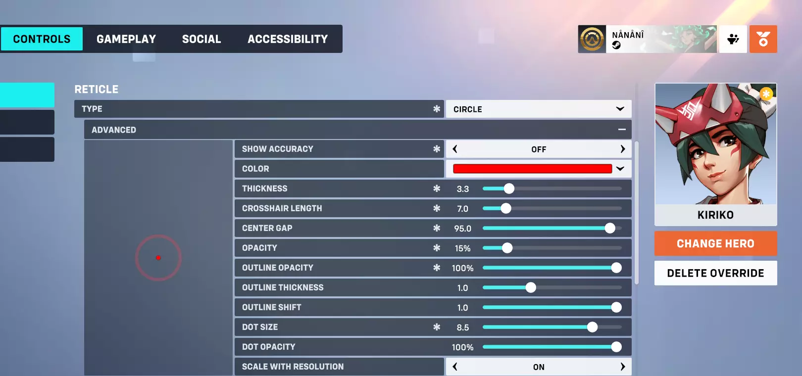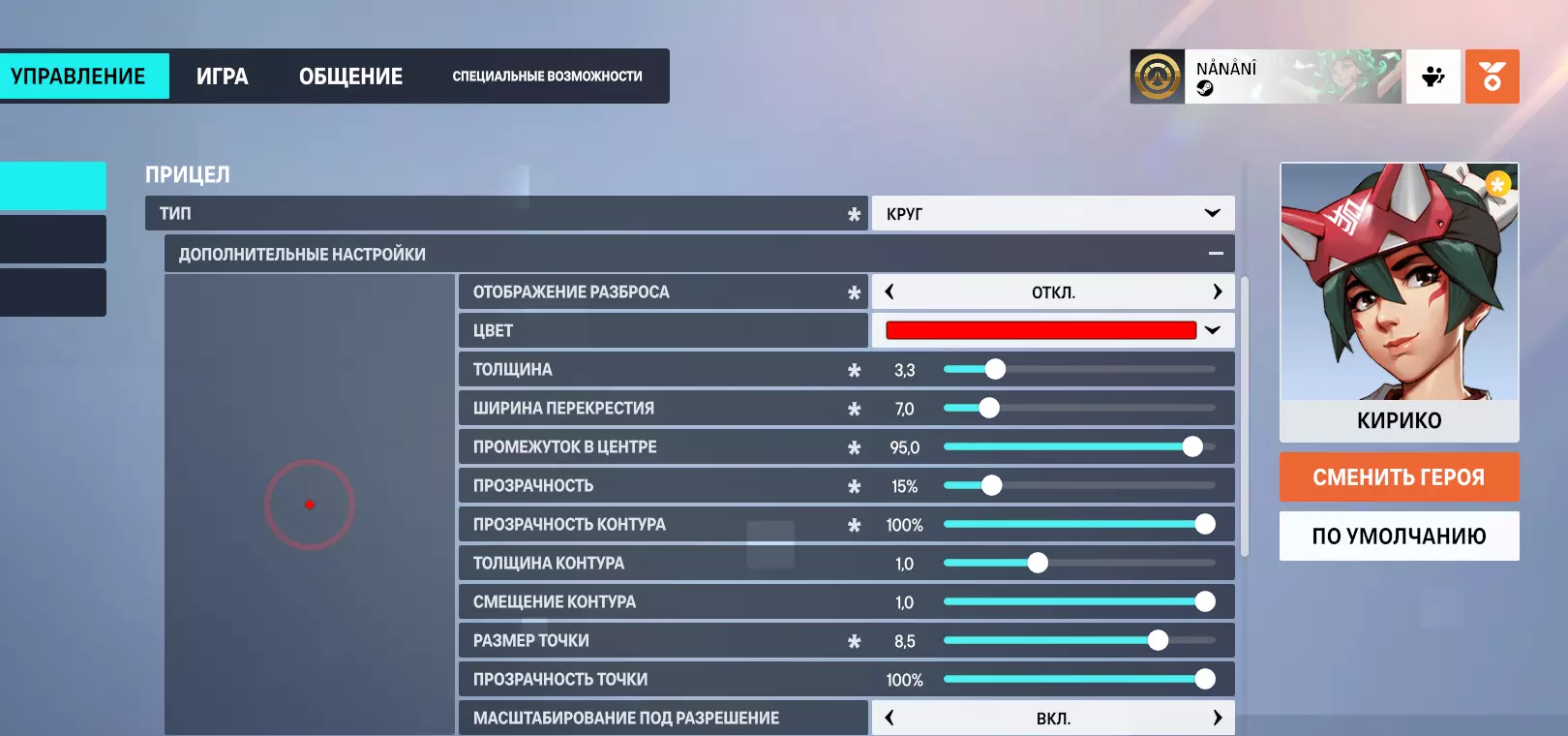 圆形弹道专为移动目标设计,而准星自然适用于固定目标。对于快节奏游戏来说,这种瞄准方式非常不适应,建议先在靶场或与机器人进行一些练习。在敌方队伍后方进行击杀时非常有用,当敌人没有发现你,并且需要确保击中从出生点或其他地方跑向团队/目标的敌人时(此时他们不会躲避,所以瞄准轨迹会生效)。准星在动态战斗中同样适用。当目标移动且闪避方式较为随机时,可以瞄准其整体判定范围,在近中距离攻击身体;若处于远距离,则最好选择靠近目标或拉开距离。当积累了足够经验后,需要将准星保持在头部高度,并让准星圆圈的终点精确对准目标头部。当敌人因你的注视而向左逃跑时,将准星的右侧线条对准其头部;若敌人向右逃跑,则将准星的左侧线条对准其头部。这种方法能确保命中目标,关键在于习惯这种新的瞄准方式。 最初的任务是治疗和拯救,但经常会出现需要自我保护、消灭敌人或对抗来自DPS教派的可怕【莫伊拉】的情况。对于刚开始使用雾子或经常使用雾子的玩家来说非常合适。为了适应这个准星,进入设置-控制-更换英雄,然后选择雾子。使用下方截图来设置雾子专用的新准星。 设置 俄语准星设置截图。